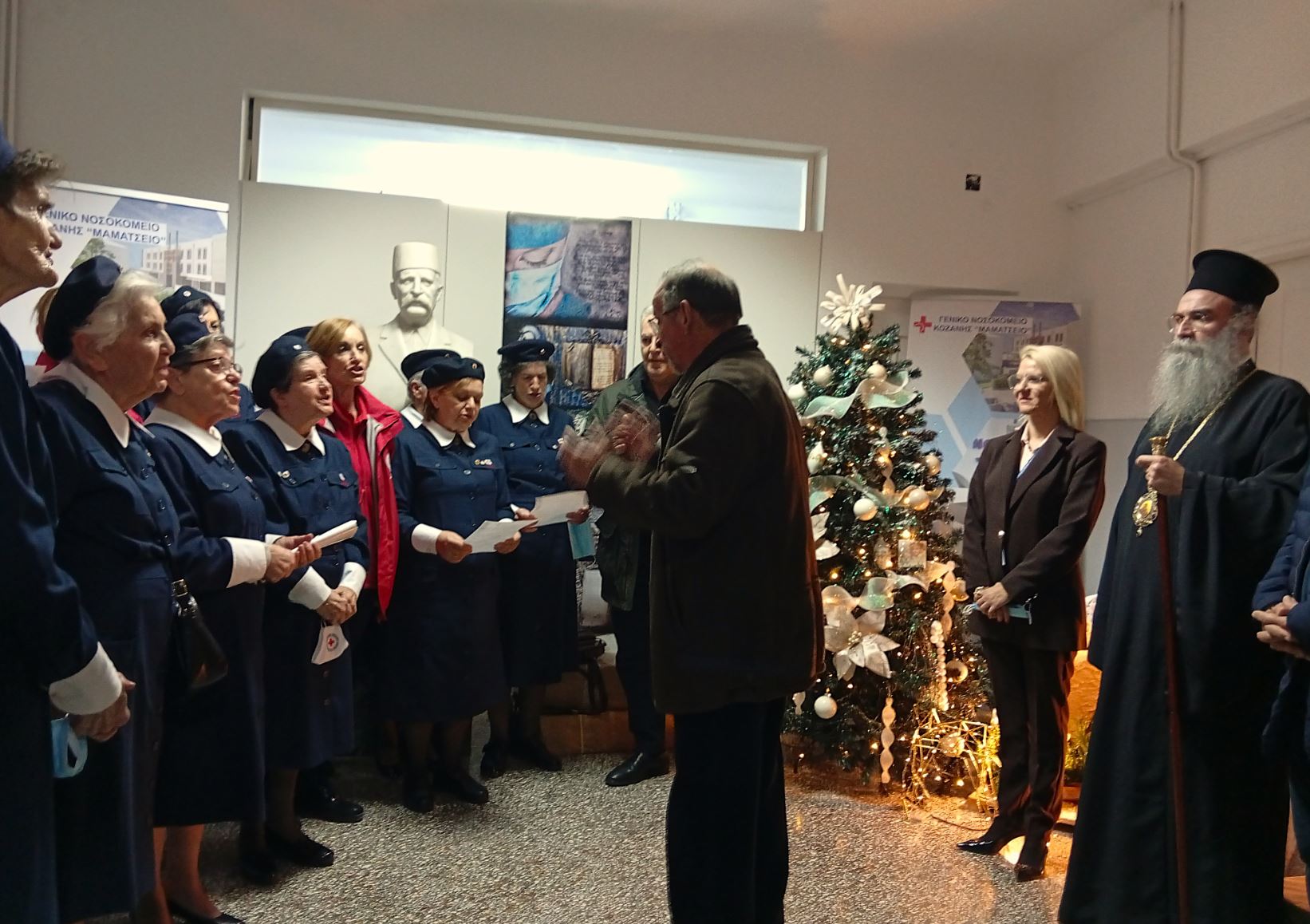 Η χορωδία των εθελοντών του Π.Τ. Κοζάνης, ο εθελοντής μαέστρος κος Δημήτριος Δασκαλόπουλος και ο κος Χρήστος Σιώπης (που έπαιξε τουμπελέκι), επισκέφθηκαν το «Μαμάτσειο» Γ.Ν. Κοζάνης κι έψαλλαν τα παραδοσιακά κάλαντα των Χριστουγέννων στη Διοικήτρια του νοσοκομείου κα Καπάτου Ευτυχία, στο ιατρικό, νοσηλευτικό και διοικητικό προσωπικό καθώς και στους νοσηλευόμενους ασθενείς, ενώ παραβρέθηκαν και στο Ευχέλαιο που τέλεσε ο Θεοφιλέστατος Επίσκοπος Αμφιπόλεως κ. Χριστοφόρος. Με αισθήματα αλληλεγγύης και ανθρωπιάς οι Ερυθροσταυρίτες και οι Ερυθροσταυρίτισσες μετέφεραν το χαρμόσυνο μήνυμα της Γέννησης του Χριστού που χαρίζει ελπίδα και παρηγοριά στις δοκιμασμένες ψυχές των νοσηλευομένων και των συνοδών τους.