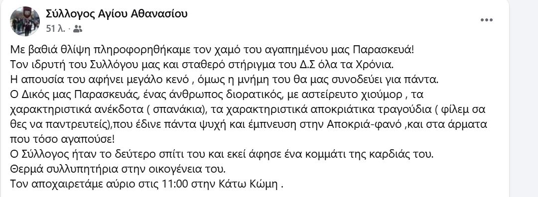 Με βαθιά θλίψη πληροφορηθήκαμε τον χαμό του αγαπημένου μας Παρασκευά!