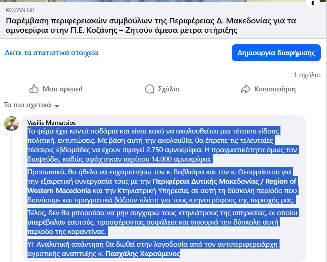 Ο Βασίλης Μαμάτσιος, συνεργάτης του Αντιπεριφερειάρχη Αγροτικής Ανάπτυξης Πασχάλη Χαρούμενου, απαντά στoν Γ. Κασαπίδη και την παράταξή του, σε σχέση με την ανακοίνωση (δείτε εδώ) και τις ευθύνες που προσάπτουν στην Περιφερειακή Αρχή. Όπως γράφει: “Το ψέμα έχει κοντά ποδάρια και είναι κακό να ακολουθείται μια τέτοιου είδους πολιτική. εντυπώσεις. Με βάση αυτή την ακολουθία, θα έπρεπε τις τελευταίες τέσσερις εβδομάδες να έχουν σφαγεί 2.750 αμνοερίφια. Η πραγματικότητα όμως τον διαψεύδει, καθώς σφάχτηκαν περίπου 14.000 αμνοερίφια.