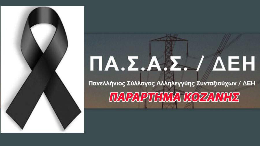 Τα μέλη του Δ.Σ του Τοπικού Παραρτήματος Κοζάνης του ΠΑ.Σ.Α.Σ/ΔΕΗ εκφράζουμε τη λύπη μας για την απώλεια του συναγωνιστή μας Γιώργου Διαμαντόπουλου και στέλνουμε τα θερμά μας συλλυπητήρια στην οικογένειά του.