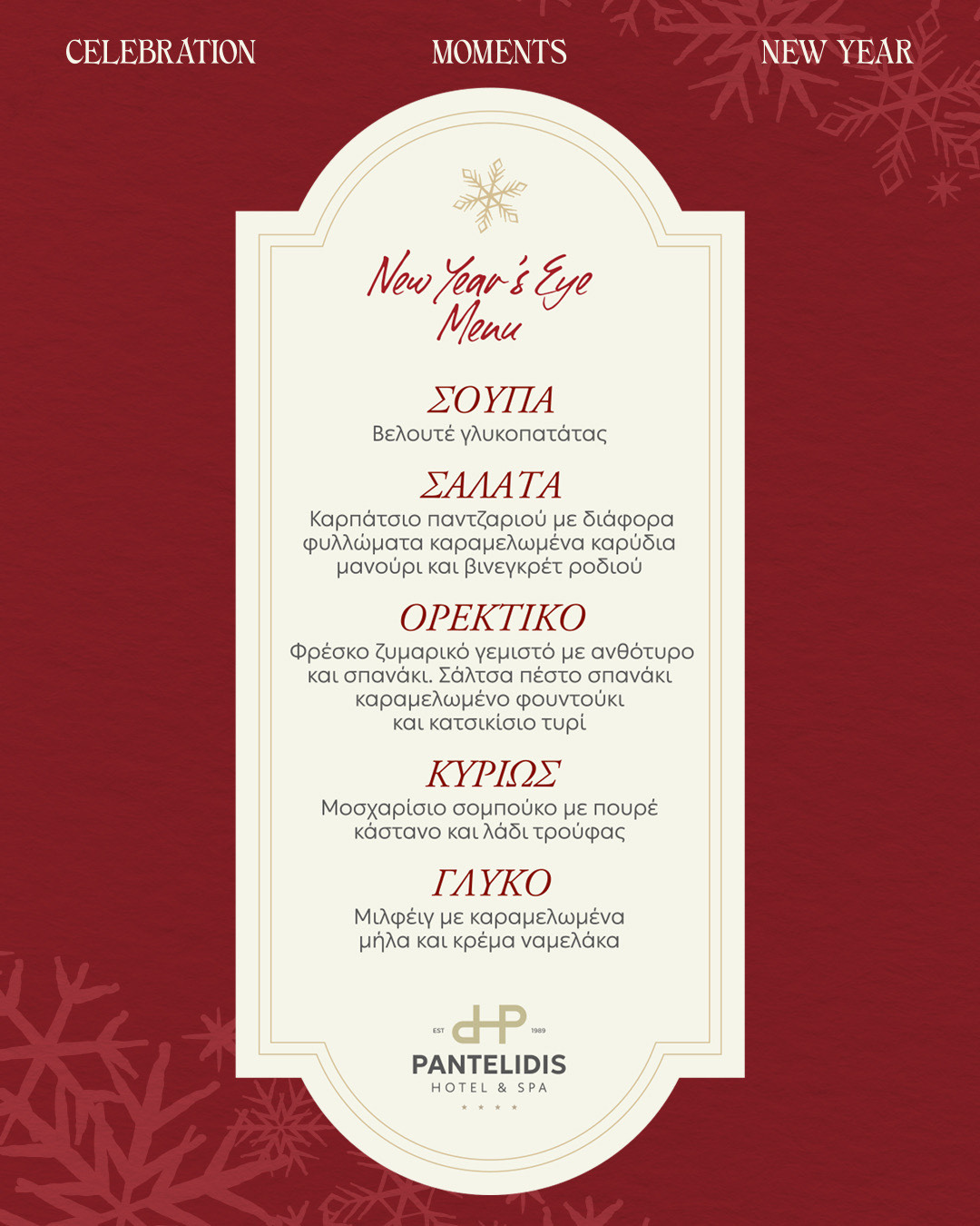 Σας περιμένουμε για την αλλαγή του χρόνου σε ένα ζεστό και γιορτινό περιβάλλον, με ξεχωριστό μενού Πρωτοχρονιάς, άψογη φιλοξενία και ζωντανή μουσική.
