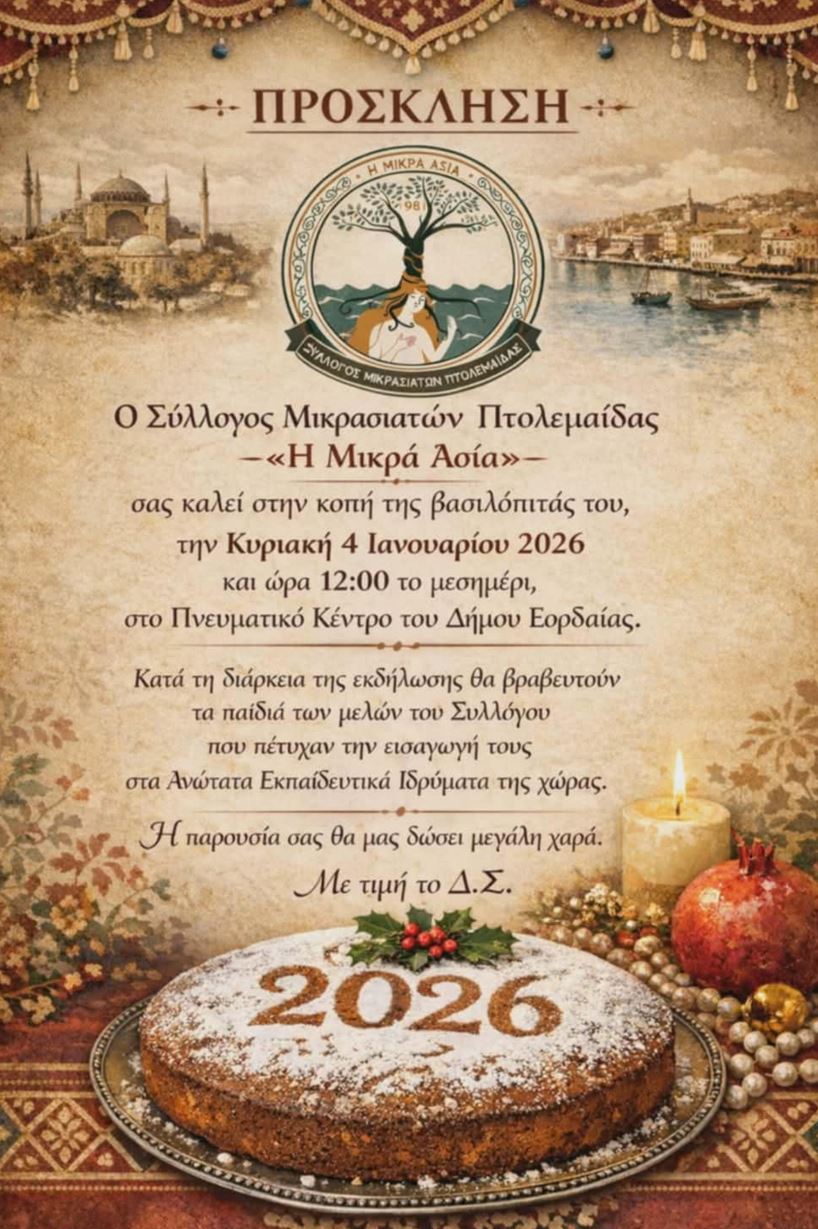 Ο Σύλλογος Μικρασιατών Πτολεμαΐδας σας προσκαλεί στην κοπή βασιλόπιτας που θα γίνει την Κυριακή 4 Ιανουαρίου 2026 και ώρα 12 το μεσημέρι στο Πνευματικό κέντρο του Δήμου Εορδαίας.