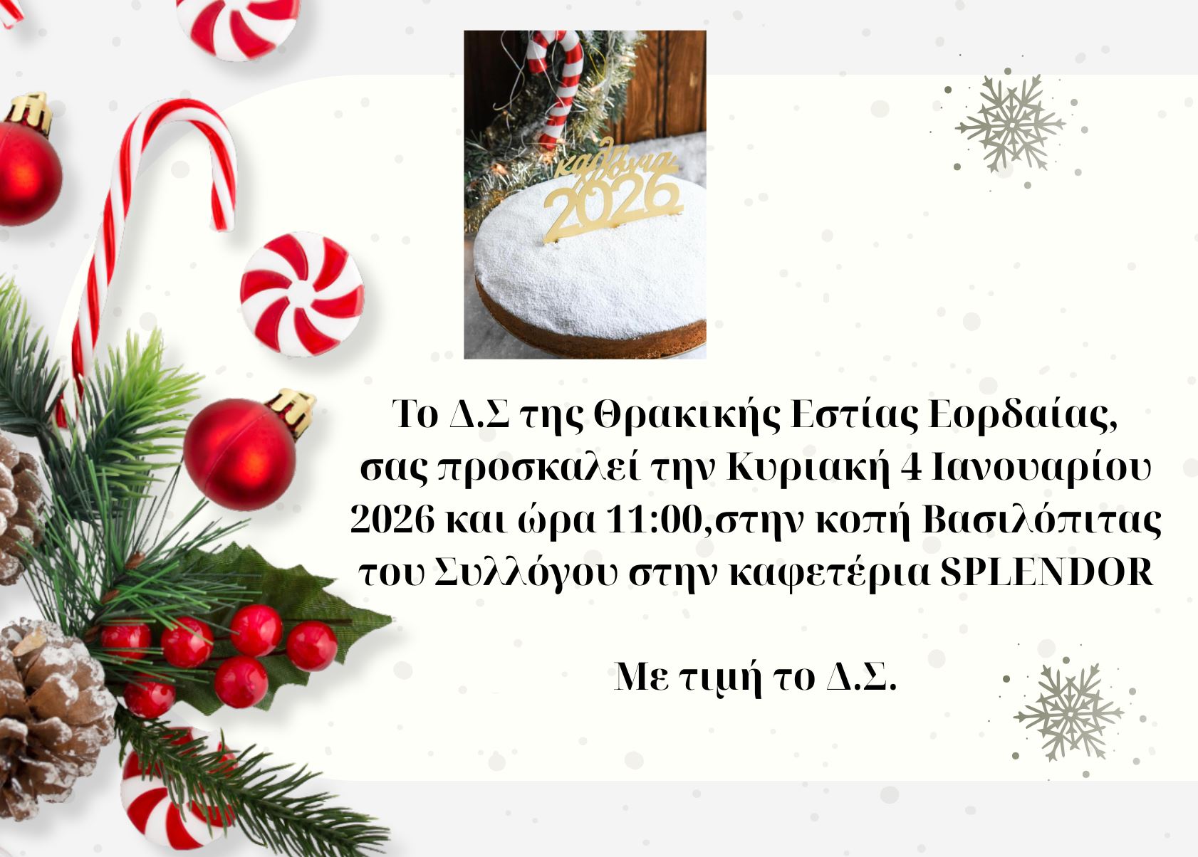 Θρακική Εστία Εορδαίας: Κοπή βασιλόπιτας την Κυριακή 4 Ιανουαρίου κι ώρα 11 π.μ.