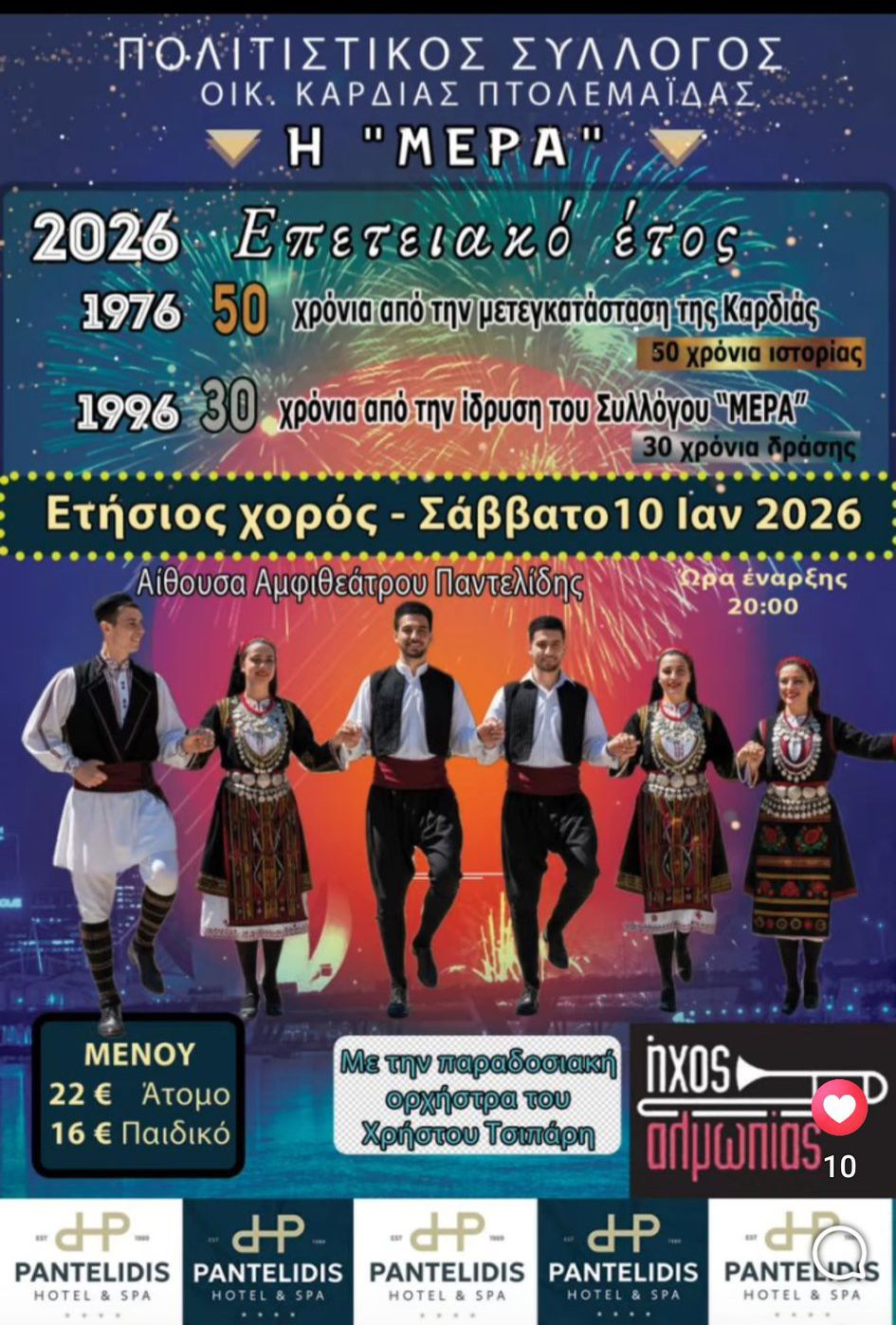 Το Σάββατο 10 Ιανουαρίου 2026 ο Πολιτιστικός Σύλλογος Οικισμού Καρδιάς Πτολεμαΐδας «Η Μέρα» διοργανώνει τον ετήσιο χορό του, σε μια βραδιά με έντονο επετειακό χαρακτήρα.