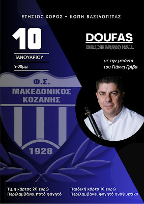 Ο Μακεδονικός Κοζάνης σας προσκαλεί στον καθιερωμένο και άκρως επιτυχημένο ετήσιο χορό του, το Σάββατο 10 Ιανουαρίου, στο κομψό και φιλόξενο Doufas deluxe music hall.