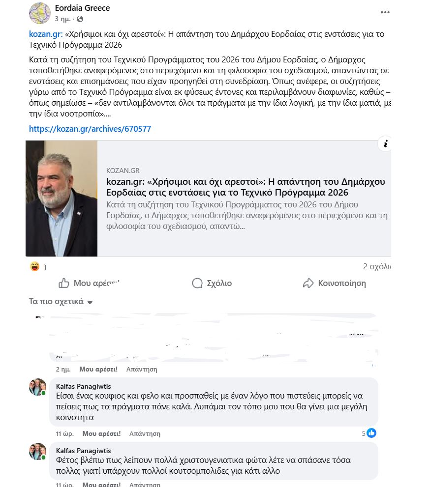 Ο Π. Κάλφας κατά την προηγούμενη αυτοδιοικητική θητεία διετέλεσε Αντιδήμαρχος Επιχειρηματικότητας, Εμπορίου και Αγροτικής Ανάπτυξης, ωστόσο ανεξαρτητοποιήθηκε τον Απρίλιο του 2023 από την παράταξη του Δημάρχου Π. Πλακεντά «Ενωμένη Εορδαία», διαφωνώντας – όπως είχε δηλώσει τότε – με τους χειρισμούς της δημοτικής αρχής στο μείζον ζήτημα της απολιγνιτοποίησης. Έκτοτε, η κριτική που ασκούσε στα μέσα κοινωνικής δικτύωσης ήταν προσεκτική και μετρημένη. Όμως, όπως αποδεικνύεται, τα πράγματα φαίνεται πως έχουν πάρει διαφορετική τροπή. Σχολιάζοντας κάτω από ανάρτηση του kozan.gr, που αφορά την πρόσφατη συζήτηση του Τεχνικού Προγράμματος για το 2026, ο κ. Κάλφας προχώρησε σε χαρακτηρισμούς κι υπονοούμενα, κατά του Δημάρχου Εορδαίας, που δεν συνηθίζει, γράφοντας μεταξύ άλλων: «Είσαι ένας κούφιος και φελλός και προσπαθείς με έναν λόγο που πιστεύεις μπορείς να πείσεις πως τα πράγματα πάνε καλά. Λυπάμαι τον τόπο μου που θα γίνει μια μεγάλη κοινότητα». Λίγο αργότερα, επανήλθε με νέο σχόλιο, αυτή τη φορά με σαφή ειρωνική διάθεση: «Φέτος βλέπω πως λείπουν πολλά χριστουγεννιάτικα φώτα λέτε να σπάσανε τόσα πολλά; γιατί υπάρχουν πολλοί κουτσομπόληδες για κάτι άλλο».