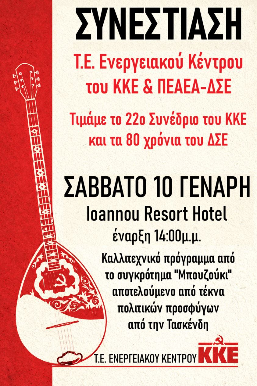 Με τη συνεστίαση τιμάμε το 22ο Συνέδριο του ΚΚΕ και τα 80 χρόνια από την ίδρυση του Δημοκρατικού Στρατού Ελλάδας, αναδεικνύοντας την ιστορική προσφορά και τους αγώνες του λαϊκού κινήματος.