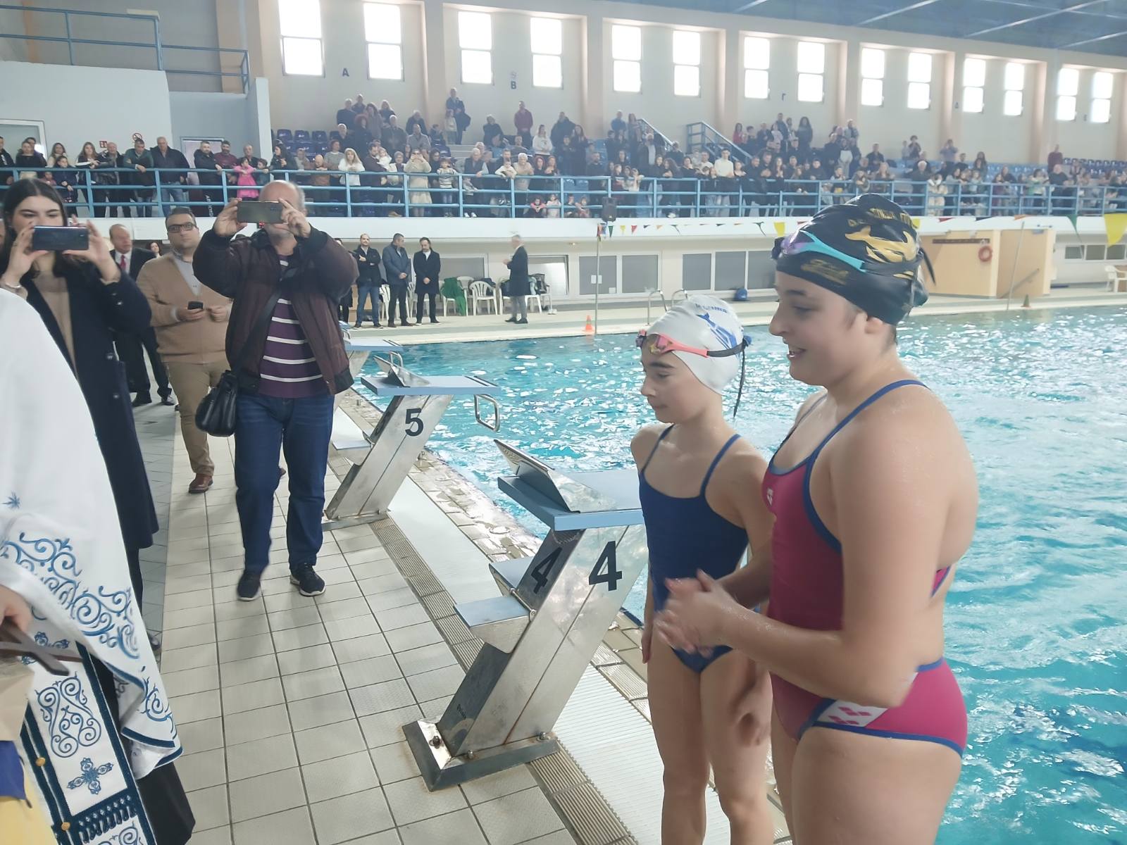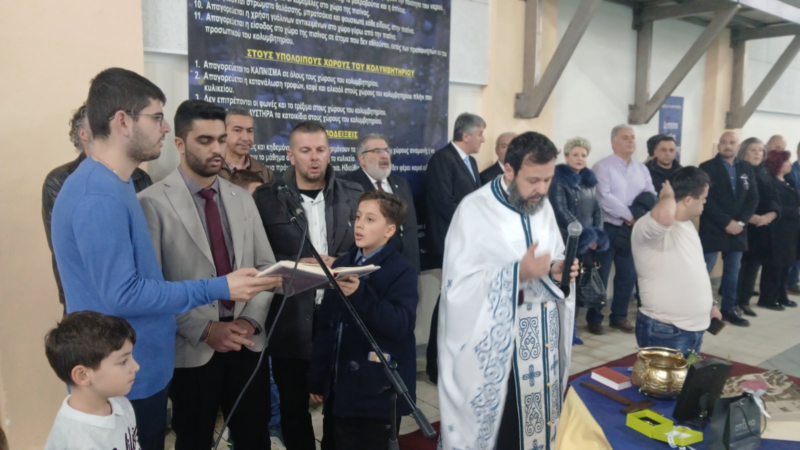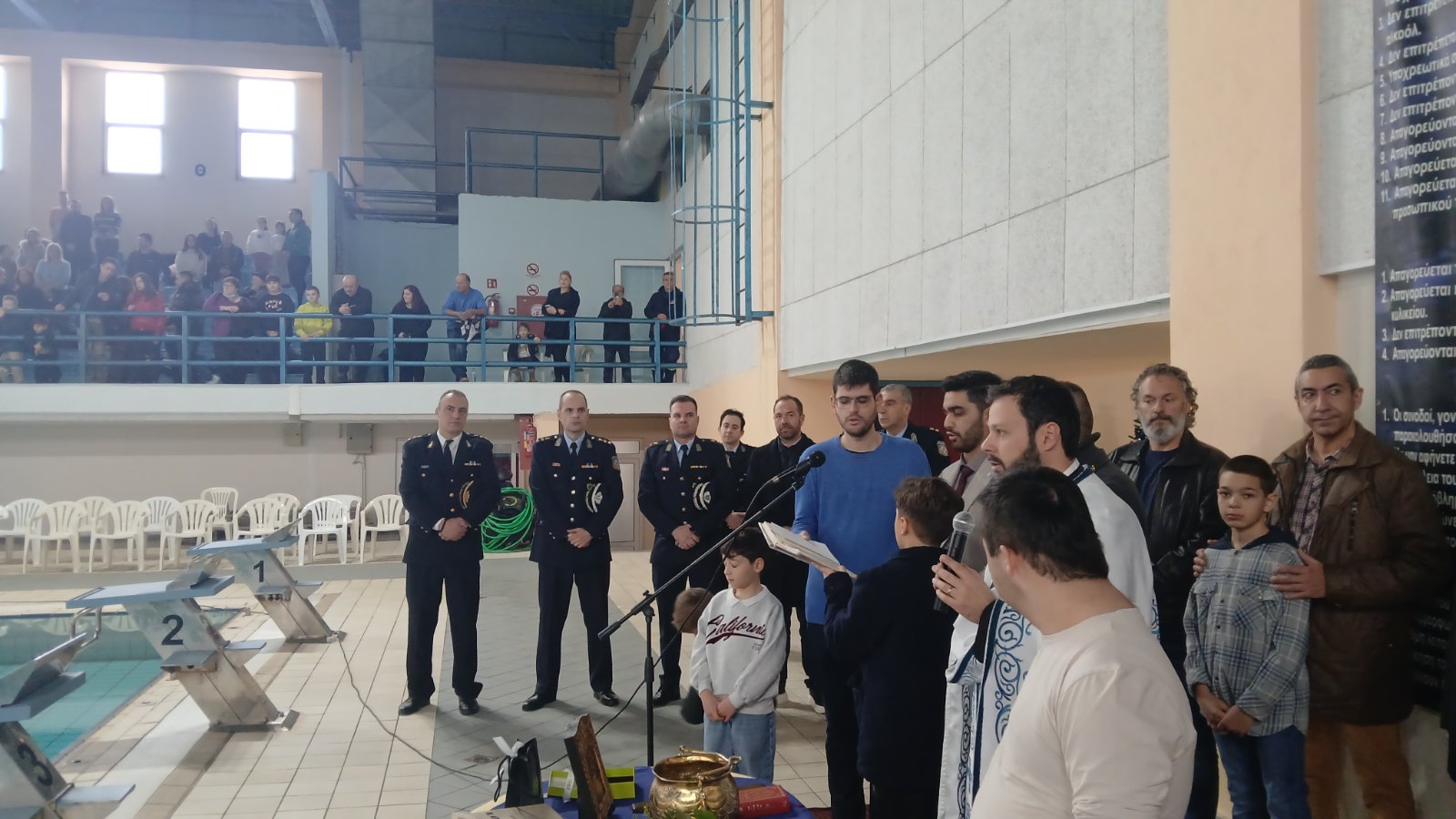 Ο αγιασμός των υδάτων και η ρίψη του Τιμίου Σταυρού στο Δημοτικό Κολυμβητήριο Πτολεμαίδας για τον εορτασμό των Θεοφανίων.