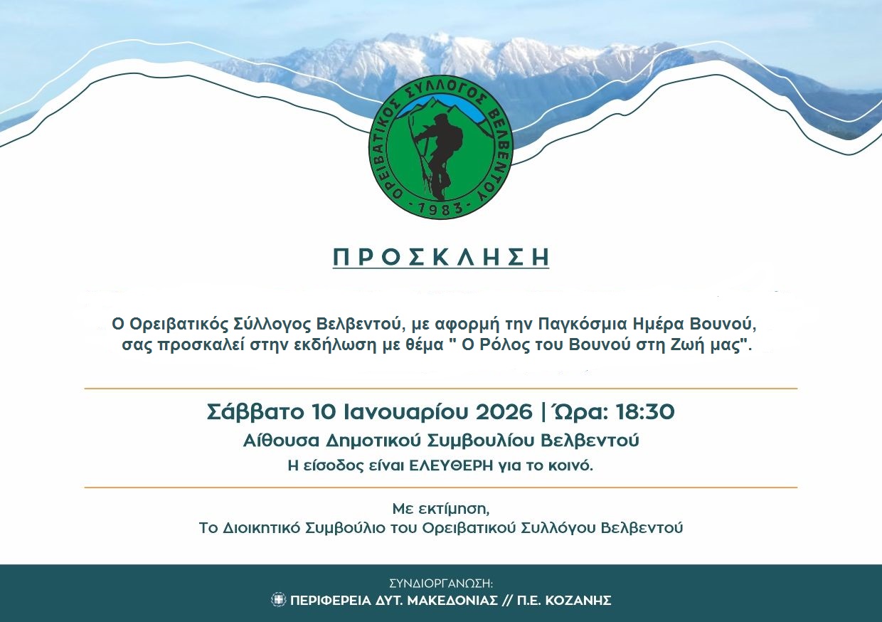 Ο Ορειβατικός Σύλλογος Βελβεντού, με αφορμή την Παγκόσμια Ημέρα Βουνού, προσκαλεί το κοινό σε εκδήλωση με θέμα «Ο ρόλος του βουνού στη ζωή μας», το Σάββατο 10 Ιανουαρίου 2026, στις 18:30, στην Αίθουσα Δημοτικού Συμβουλίου Βελβεντού.