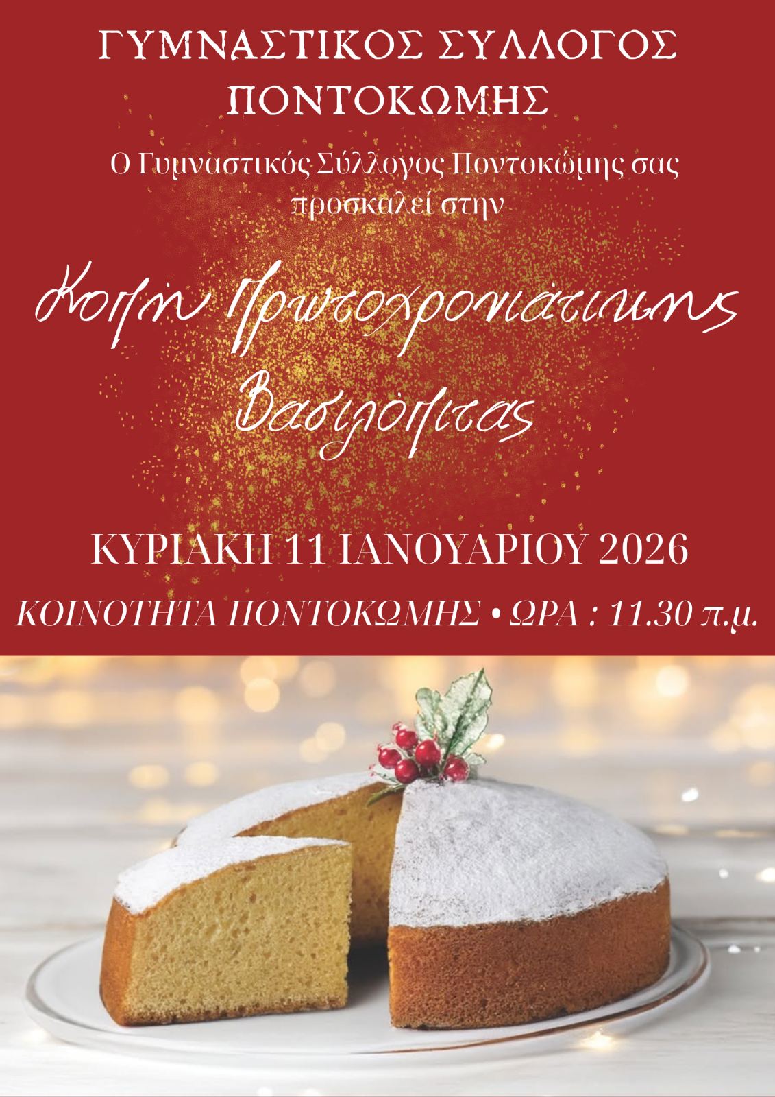 Ο Γυμναστικός Σύλλογος Ποντοκώμης προσκαλεί τα μέλη και τους φίλους του, στην κοπή της πρωτοχρονιάτικης βασιλόπιτας που θα πραγματοποιηθεί την Κυριακή 11 Ιανουαρίου 2026 στην Κοινότητα Ποντοκώμης και ώρα 11.30π.μ. Επιπλέον θα παρουσιαστεί το νεοεκλεγμένο Δ.Σ. του συλλόγου και θα δοθούν έπαινοι στα παιδιά του χωριού που εισήχθησαν στις πανελλαδικές εξετάσεις τις χρονιές 2023-2025.