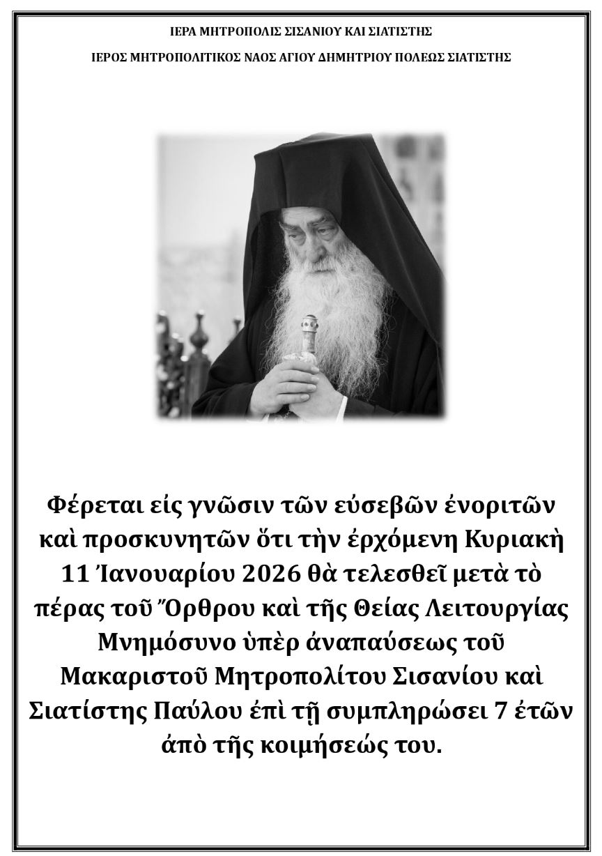 Φέρεται εἰς γνῶσιν τῶν εὐσεβῶν ἐνοριτῶν καὶ προσκυνητῶν ὅτι τὴν ἐρχόμενη Κυριακὴ 11 Ἰανουαρίου 2026 θὰ τελεσθεῖ μετὰ τὸ πέρας τοῦ Ὄρθρου καὶ τῆς Θείας Λειτουργίας Μνημόσυνο ὑπὲρ ἀναπαύσεως τοῦ Μακαριστοῦ Μητροπολίτου Σισανίου καὶ Σιατίστης Παύλου ἐπὶ τῇ συμπληρώσει 7 ἐτῶν ἀπὸ τῆς κοιμήσεώς του.