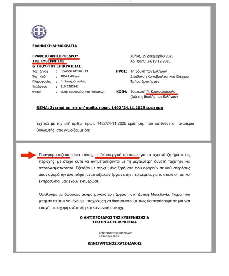 Την απάντηση του Αντιπροέδρου της Κυβέρνησης, κ. Κ. Χατζηδάκη, για την υλοποίηση ή μη της δέσμευσης που ο ίδιος εγγράφως ανέλαβε πριν 4 μήνες προς τους Δυτικομακεδόνες, έδωσε στη δημοσιότητα ο Πάρις Κουκουλόπουλος.