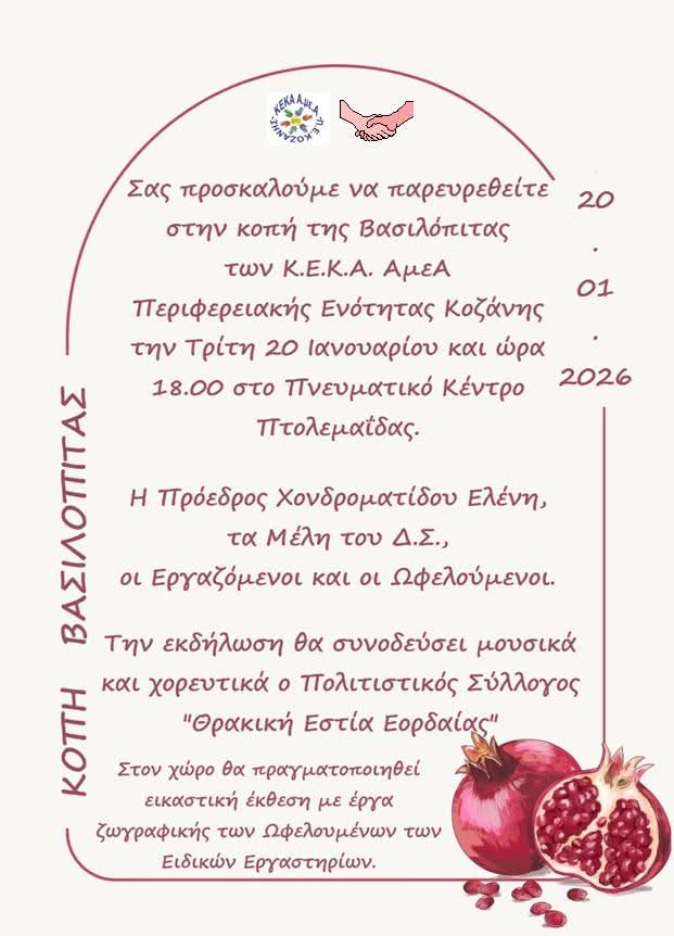 Κοπή πίτας των Κ.Ε.Κ.Α. ΑμεΑ Π.Ε. Κοζάνης, την Τρίτη 20 Ιανουαρίου, στο Πνευματικό Κέντρο Πτολεμαϊδας .