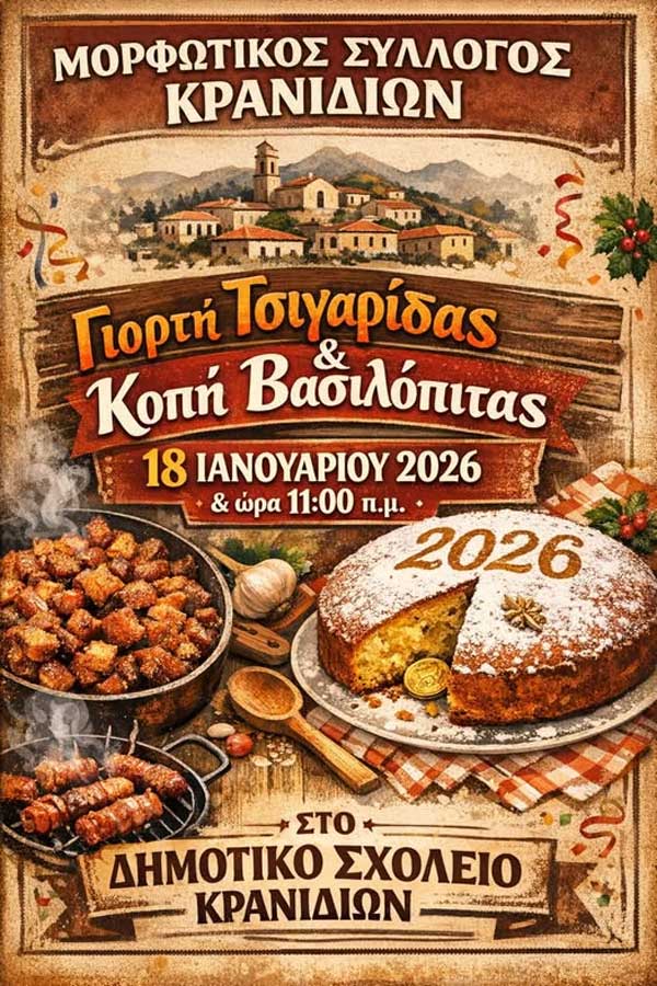 Ο Μορφωτικός Σύλλογος Κρανιδίων θα πραγματοποιήσει Γιορτή Τσιγαρίδας και κοπή βασιλόπιτας την Κυριακή 18 Ιανουαρίου και ώρα 11:00π.μ. στο δημοτικό σχολείο Κρανιδίων.