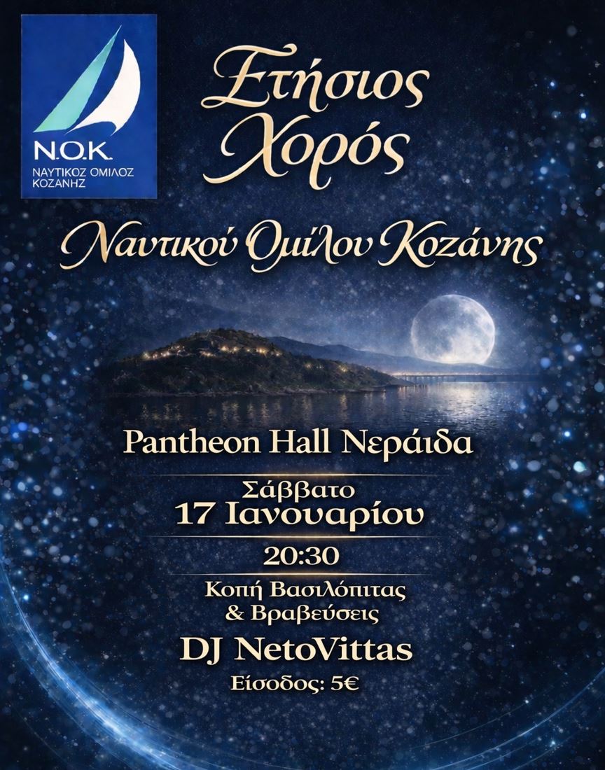 Ο Ναυτικός Όμιλος Κοζάνης « Ο ΑΛΙΑΚΜΩΝ », ενημερώνει τα μέλη και τους φίλους του, ότι η εκδήλωση για τον ετήσιο χορό καθώς και την κοπή της βασιλόπιτας του Ομίλου θα πραγματοποιηθεί στις 17 Ιανουαρίου 2026 και ώρα 20¨30 στο Pantheon Hall Νεράιδα Κοζάνης .