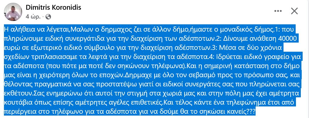 Το ζήτημα της διαχείρισης των αδέσποτων ζώων βρέθηκε στο επίκεντρο της ειδικής συνεδρίασης λογοδοσίας του Δημοτικού Συμβουλίου Κοζάνης, που πραγματοποιήθηκε το βράδυ της Τετάρτης 14 Ιανουαρίου, με τον Δήμαρχο Κοζάνης να σημειώνει πως το πρόβλημα δεν έχει λυθεί ωστόσο έχει σταθεροποιηθεί η κατάσταση (δείτε εδώ το σχετικό ρεπορτάζ του kozan.gr). Με αφορμή αυτή τη δήλωση, ο ανεξάρτητος δημοτικός σύμβουλος Δημήτρη Κορωνίδης, με ανάρτησή του στο facebook, τοποθετήθηκε με ιδιαίτερα αιχμηρό τρόπο για την κατάσταση που επικρατεί σήμερα στον Δήμο για το συγκεκριμένο ζήτημα. Όπως γράφει: “Η αλήθεια να λέγεται, μάλλον ο Δήμαρχος ζει σε άλλον δήμο Ήμαστε ο μοναδικός δήμος 1) που πληρώνουμε ειδική συνεργάτιδα για την διαχείριση των αδέσποτων. 2) Δίνουμε ανάθεση 40000 ευρώ σε εξωτερικό ειδικό σύμβουλο για την διαχείριση αδέσποτων. 3) Μέσα σε δύο χρόνια σχεδίων τριπλασιάσαμε τα λεφτά για την διαχείριση τα αδέσποτα. 4) Ιδρύεται ειδικό γραφείο για τα αδέσποτα (που πότε μα ποτέ δεν σηκώνουν τηλέφωνα). Και η σημερινή κατάσταση στο δήμο μας είναι η χειρότερη όλων το εποχών. Δήμαρχε με όλο τον σεβασμό προς το πρόσωπο σας, και θέλοντας πραγματικά να σας προστατέψω γιατί οι ειδικοί συνεργάτες σας που πληρώνεται σας εκθέτουν.Σας ενημερώνω ότι αυτοί την στιγμή στα χωριά μας και στην πόλη μας έχει αμέτρητα κουτάβια όπως επίσης αμέτρητες αγέλες επιθετικές.Και τέλος κάντε ένα τηλεφώνημα έτσι από περιέργεια στο τηλέφωνο για τα αδέσποτα για να δούμε θα το σηκώσει κανείς???”