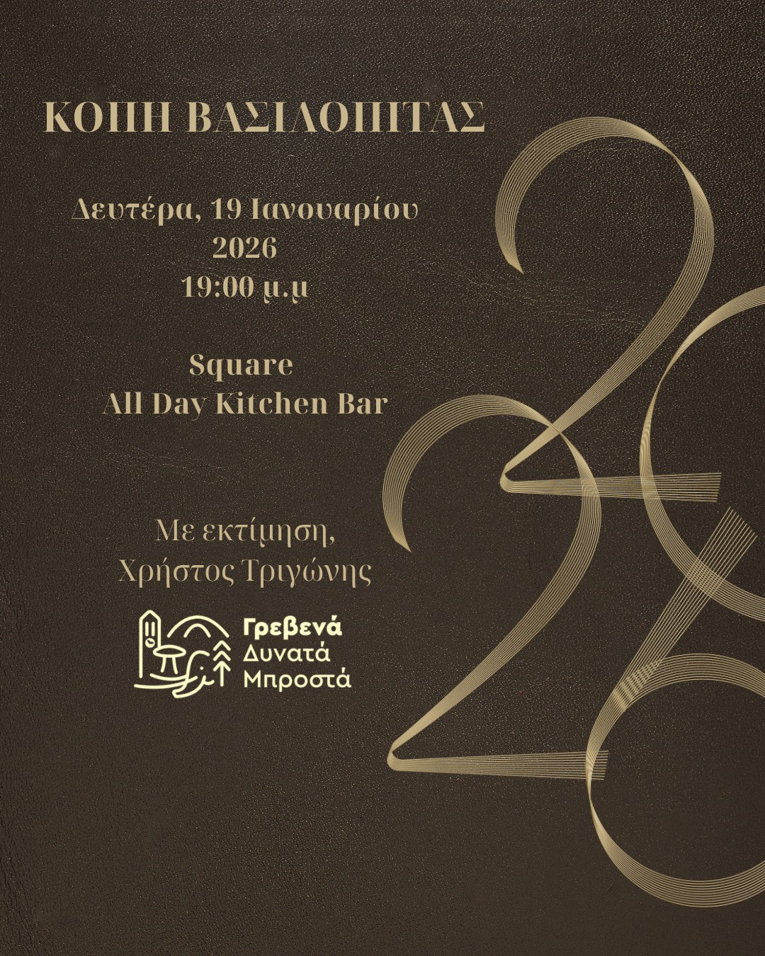 Προσκαλούμε τα μέλη και τους φίλους του αυτοδιοικητικού συνδυασμού ΓΡΕΒΕΝΑ ΔΥΝΑΤΑ ΜΠΡΟΣΤΑ, στην κοπή της Βασιλόπιτας που θα πραγματοποιηθεί την Δευτέρα 19 Ιανουαρίου 2026 και ώρα 19:00 στο καφέ SQUARE στην κεντρική πλατεία Γρεβενών.