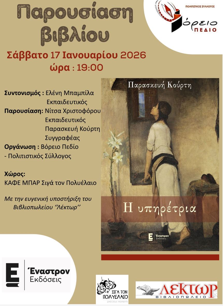Ο Πολιτιστικός Σύλλογος Βόρειο Πεδίο, η συγγραφέας Παρασκευή Κούρτη και οι εκδόσεις Έναστρον σάς προσκαλούν στην παρουσίαση του βιβλίου «Η υπηρέτρια» το Σάββατο 17 Ιανουαρίου 2026 και ώρα 19:00 στον φιλόξενο χώρο του ΚΑΦΕ ΜΠΑΡ «Σιγά τον Πολυέλαιο». Συντονίζει η εκπαιδευτικός Ελένη Μπαμπίλα και παρουσιάζουν η εκπαιδευτικός Νίτσα Χριστοφόρου και η συγγραφέας Παρασκευή Κούρτη. Η παρουσίαση γίνεται με την ευγενική υποστήριξη του βιβλιοπωλείου «Λέκτωρ».