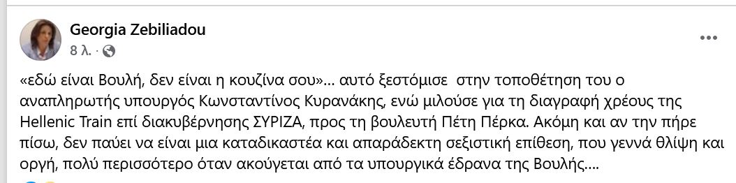 Σε ανάρτησή της στο facebook η επικεφαλής της ελάσσονος αντιπολίτευση στο Περιφερειακό Συμβουλίου Δ. Μακεδονίας κα. Γεωργία Ζεμπιλιάδου γράφει: «εδώ είναι Βουλή, δεν είναι η κουζίνα σου»… αυτό ξεστόμισε στην τοποθέτηση του ο αναπληρωτής υπουργός Κωνσταντίνος Κυρανάκης, ενώ μιλούσε για τη διαγραφή χρέους της Hellenic Train επί διακυβέρνησης ΣΥΡΙΖΑ, προς τη βουλευτή Πέτη Πέρκα. Ακόμη και αν την πήρε πίσω, δεν παύει να είναι μια καταδικαστέα και απαράδεκτη σεξιστική επίθεση, που γεννά θλίψη και οργή, πολύ περισσότερο όταν ακούγεται από τα υπουργικά έδρανα της Βουλής….”