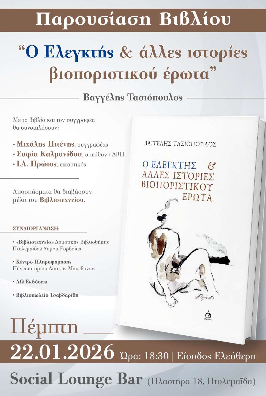 Η εκδήλωση θα πραγματοποιηθεί την Πέμπτη 22 Ιανουαρίου 2026, στις 18:30, στο Social Lounge Bar (Πλαστήρα 18, Πτολεμαΐδα).