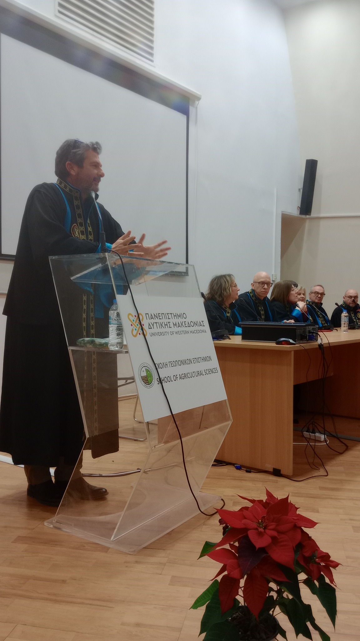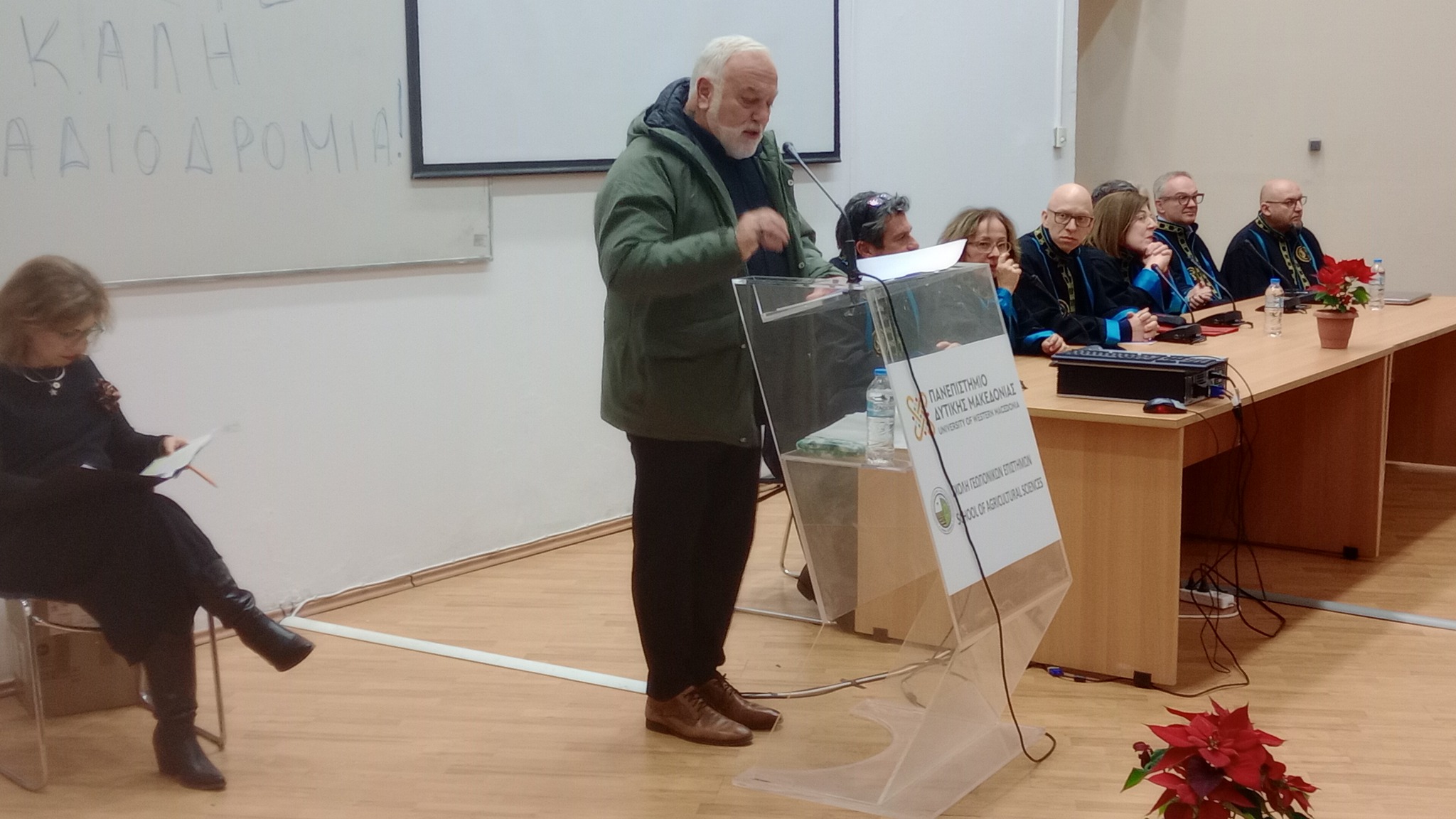 Σύντομο χαιρετισμό εκφώνησε και ο Αντιδήμαρχος του Δήμου Φλώρινας κ. Μιχάλης Χάτζιος, οποίος εξήρε την ποιοτική εκπαιδευτική και ερευνητική λειτουργία του τμήματος Γεωπονίας και ευχαρίστησε τους αποφοίτους για την προσφορά τους στην πόλη της Φλώρινας κατά τη διάρκεια των σπουδών τους.