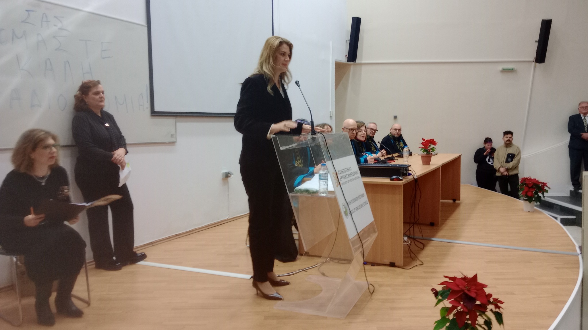 Τη διοίκηση του Πανεπιστημίου εκπροσώπησε η κ. Αικατερίνη Μέλφου, μέλος του Συμβουλίου Διοίκησης, η οποία συνεχάρη τους αποφοίτους για την επιτυχή ολοκλήρωση των σπουδών τους και επιπλέον τόνισε την ανάγκη για συνεχή ενημέρωση και επικαιροποίηση των γνώσεων τους και μετά την αποφοίτησή τους.