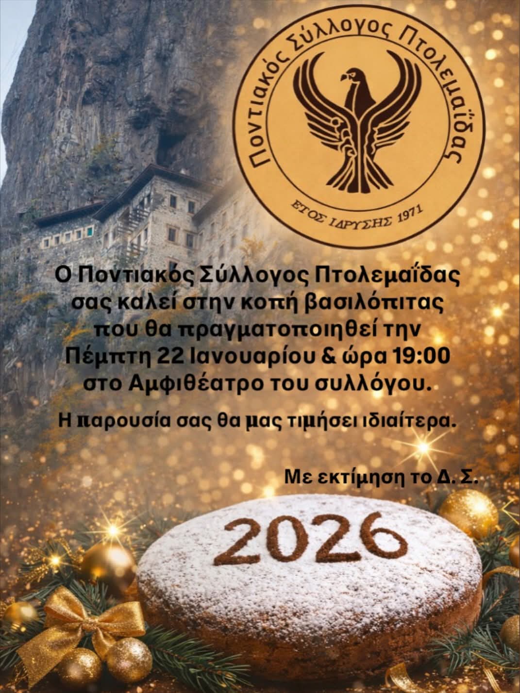 Ο Ποντιακός Σύλλογος Πτολεμαΐδας σας καλεί να παρευρεθείτε στην κοπή Βασιλόπιτας που θα πραγματοποιηθεί στο Αμφιθέατρο του συλλόγου την Πέμπτη 22 Ιανουαρίου και ώρα 19:00