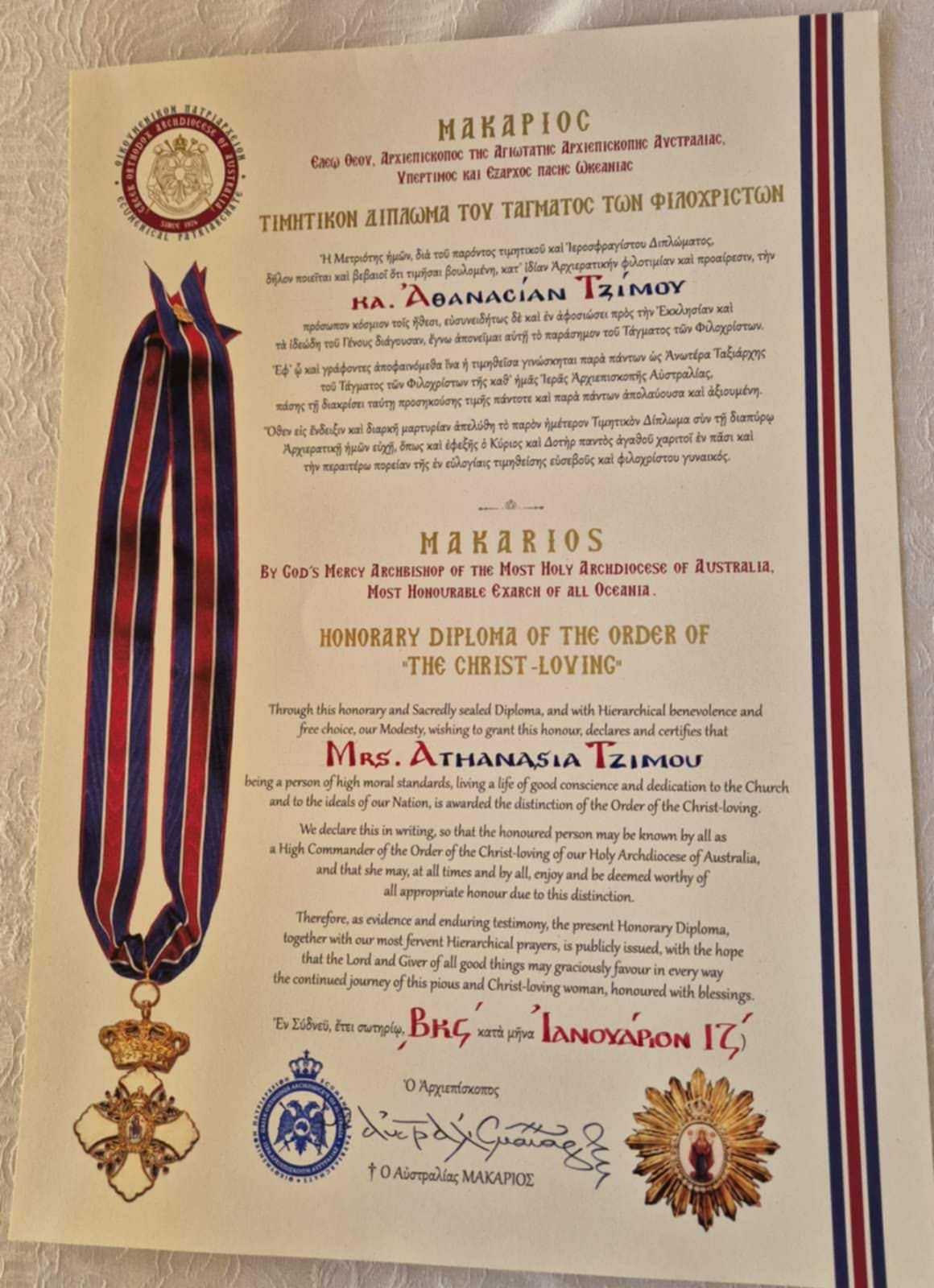Το τιμητικό δίπλωμα φέρει την υπογραφή του Αρχιεπισκόπου Αυστραλίας κ.κ. Μακαρίου και αποτελεί αναγνώριση ήθους, προσφοράς και συνέπειας, στοιχεία που χαρακτηρίζουν τη διαδρομή της τιμώμενης στην ελληνική ομογενειακή κοινότητα της Αυστραλίας. Η συγκεκριμένη διάκριση, αν και εκκλησιαστικού χαρακτήρα, συγκαταλέγεται στις ανώτερες τιμητικές αναγνωρίσεις που απονέμονται από την Ελληνορθόδοξη Αρχιεπισκοπή Αυστραλίας και αποκτά ιδιαίτερη σημασία όταν αφορά ανθρώπους της περιφέρειας και της ομογένειας, οι οποίοι διατηρούν ζωντανή τη σχέση τους με την ιδιαίτερη πατρίδα.