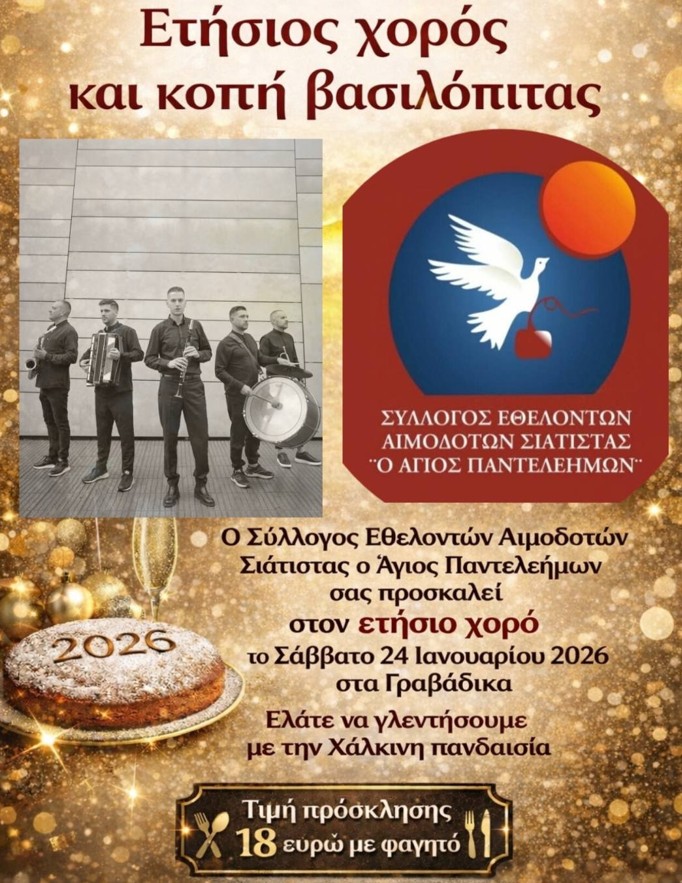 Ο Σύλλογος Εθελοντών Αιμοδοτών Σιάτιστας ο Άγιος Παντελεήμων θα πραγματοποιήσει τον ετήσιο χορό του αλλά και την κοπή της βασιλόπιτας, το Σάββατο 24 Ιανουαρίου 2026, στις 8.30 το βράδυ στα Γραβάδικα στη Σιάτιστα.
