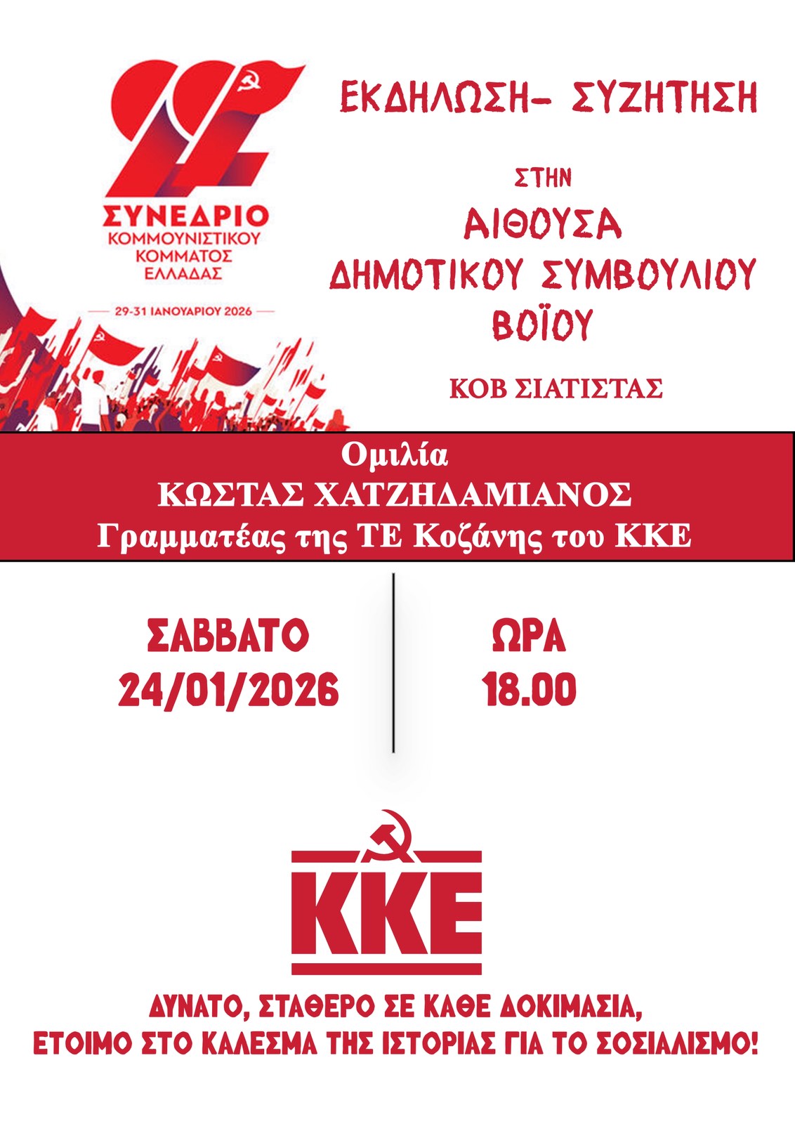 • Σάββατο 24/1, 6μμ, η ΚΟΒ Σιάτιστας, οργανώνει εκδήλωση – συζήτηση μπροστά στο 22ο συνέδριο του κόμματος στην αίθουσα συνεδριάσεων του Δημοτικού Συμβουλίου Δ. Βοίου. Θα μιλήσει ο Χατζηδαμιανος Κώστας Γραμματέας ΤΕ Κοζάνης του ΚΚΕ.