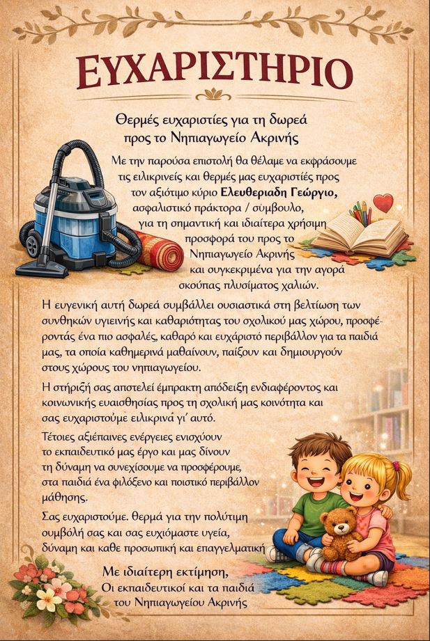 Ευχαριστήριο για τη δωρεά προς το Νηπιαγωγείο Ακρινής