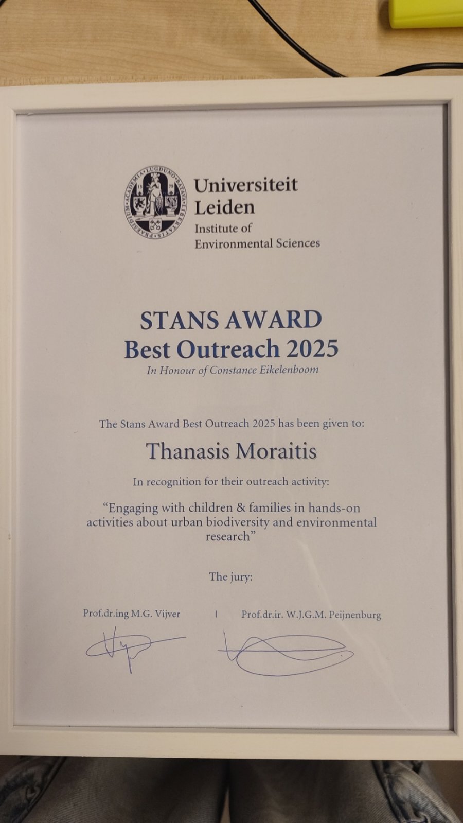 Ο Αθανάσιος Μωραΐτης τιμήθηκε με το STANS Award – Best Outreach 2025 από το Institute of Environmental Sciences του Πανεπιστημίου Leiden, για τη δράση του στη σύνδεση της επιστημονικής έρευνας με την κοινωνία, μέσα από βιωματικές δραστηριότητες περιβαλλοντικής εκπαίδευσης για παιδιά και οικογένειες.