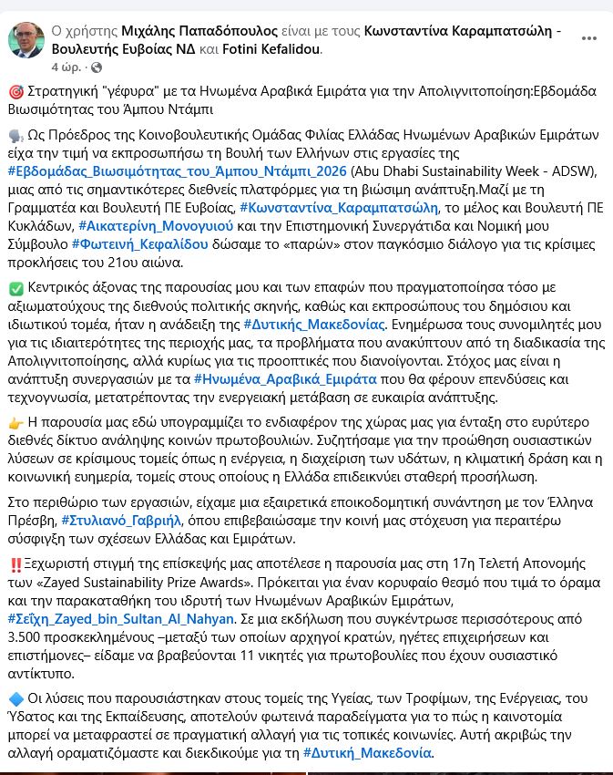 Διαβάσαμε στο προσωπικό προφίλ στο Facebook του βουλευτή Κοζάνης Μ. Παπαδόπουλου την εκτενή ανάρτησή του από την Εβδομάδα Βιωσιμότητας του Άμπου Ντάμπι. Πολλές λέξεις, πολλά hashtags, διεθνές ακροατήριο, παγκόσμιες προκλήσεις, βραβεία, πρέσβεις και φυσικά η Δυτική Μακεδονία στο κέντρο του σύμπαντος. Κεντρικός άξονας της παρουσίας του, όπως μας ενημερώνει, ήταν η «ανάδειξη της Δυτικής Μακεδονίας», τα προβλήματα της απολιγνιτοποίησης και κυρίως οι προοπτικές που διανοίγονται. Στόχος; Συνεργασίες με τα Ηνωμένα Αραβικά Εμιράτα που θα φέρουν επενδύσεις και τεχνογνωσία, μετατρέποντας την ενεργειακή μετάβαση σε ευκαιρία ανάπτυξης. Κάπου εδώ ταιριάζει και η αραβική λέξη Inshallah. Κυριολεκτικά σημαίνει «αν είναι θέλημα Θεού» ή «θέλημα Μιχάλη» θα προσθέσουμε εμείς. Βέβαια θα μας πείτε – και θα έχετε δίκιο – ο Μ. Παπαδόπουλος δεν φημίζεται, τουλάχιστον μέχρι σήμερα, για τις συζητήσεις του με επενδυτές εντός Ελλάδας, ούτε για παρεμβάσεις που θα έλεγες πως έλυσαν, έστω στο ελάχιστο, τα αναπτυξιακά προβλήματα της Δυτικής Μακεδονίας. Δεν τον θυμόμαστε να «σπρώχνει» επενδύσεις εδώ. Όμως στο Άμπου Ντάμπι φαίνεται πως τα είπε όλα. Κάτι «ξύπνησε» μέσα του και ξεπέρασε τον εαυτό του. Κι αφού το πήραμε ζεστά το θέμα, μήπως να το πάμε κι ένα βήμα παραπέρα; Γιατί δεν παραδειγματίζεται από το φίλο του Δήμαρχο Εορδαίας Π. Πλακεντά που ξέρει από αδελφοποιήσεις και να προχωρήσουμε σε μια αδελφοποίηση Άμπου Ντάμπι – Δυτικής Μακεδονίας. Γιατί όχι; Να ανταλλάξουμε τεχνογνωσία, εμπειρίες, τρόπους ζωής και να αρχίσουν και τα πηγαινέλα. Άραβες επενδυτές να κόβουν βόλτες στον κεντρικό πεζόδρομο της Κοζάνης και της Πτολεμαίδας, να χαζεύουν βιτρίνες και να πληρώνουν τον καφέ με μπουκάλια πετρελαίου. Αν μη τι άλλο, θα ήταν μια έμπρακτη συμβολή στην ενεργειακή μετάβαση. Και σίγουρα πιο απτή απ’ όσα έχουμε δει μέχρι σήμερα. Και τώρα που έρχονται κι οι Απόκριες, η ιδέα αποκτά και πολιτιστικό βάθος. Καμήλες αντί για άρματα, σεΐχηδες με σερπαντίνες, βιώσιμη ανάπτυξη σε μορφή καρναβαλιού. Να συνδυάσουμε παράδοση, καινοτομία και διεθνή διπλωματία σ’ ένα πακέτο. Γιατί όχι; Αν είναι να έρθει η ανάπτυξη, ας έρθει τουλάχιστον με κέφι.