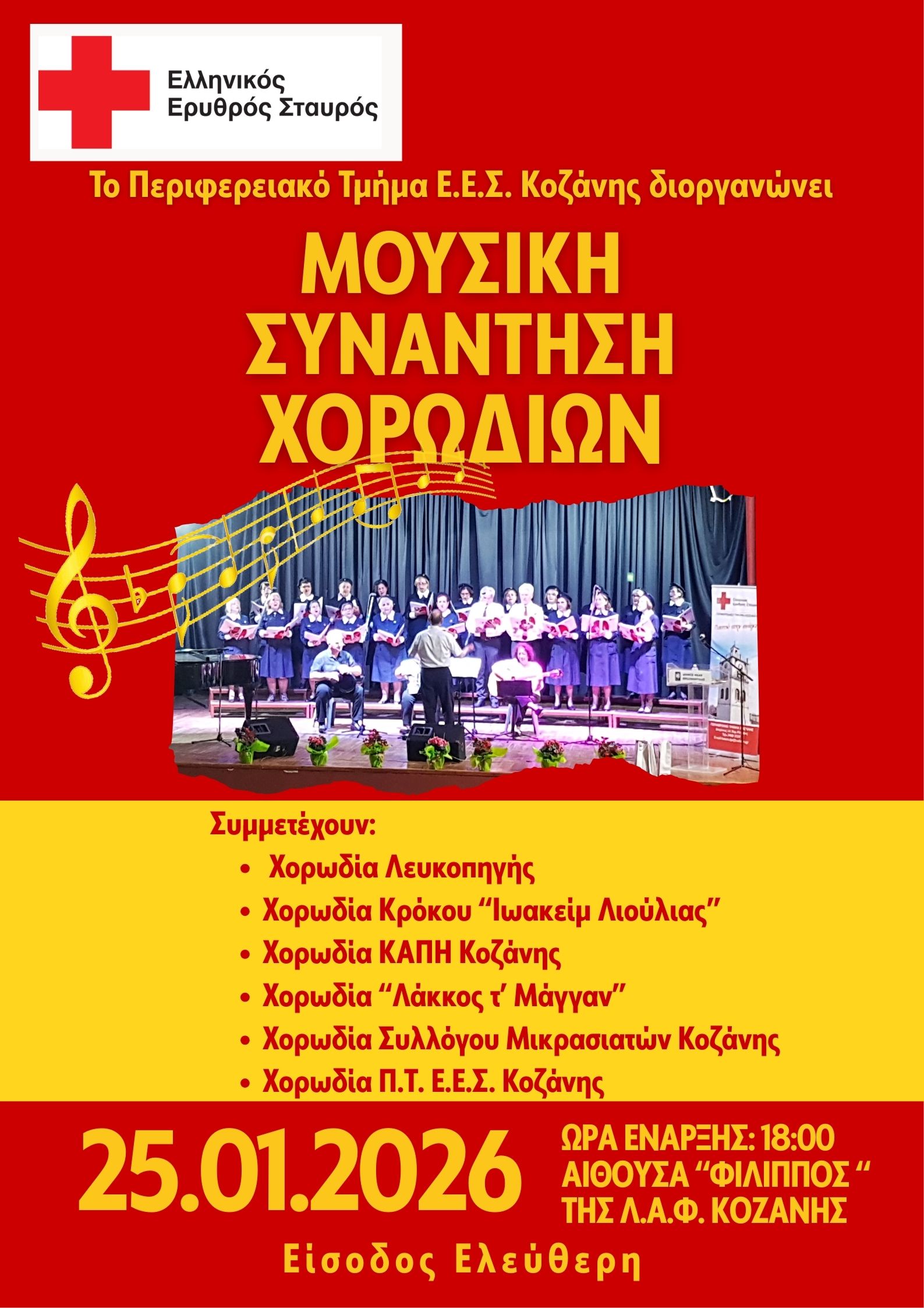 Το Περιφερειακό Τμήμα του Ελληνικού Ερυθρού Σταυρού Κοζάνης απευθύνει ανοιχτή πρόσκληση προς όλους σε εκδήλωση “Μουσική Συνάντηση Χορωδιών” την Κυριακή 25/1/2026 και ώρα 18:00 στην αίθουσα “Φίλιππος” στη Λέσχη Αξιωματικών Φρουράς Κοζάνης. Στην εκδήλωση συμμετέχουν:
