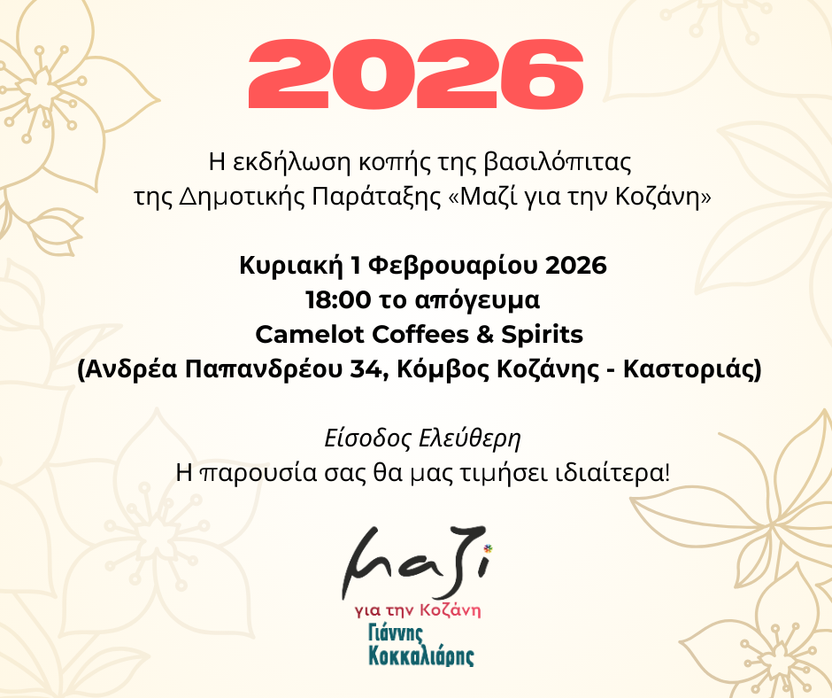 Η Δημοτική Παράταξη «Μαζί για την Κοζάνη» και ο επικεφαλής της Δήμαρχος Κοζάνης Γιάννης Κοκκαλιάρης, σας προσκαλούν στην ετήσια εκδήλωση κοπής της βασιλόπιτας του Συνδυασμού, η οποία θα πραγματοποιηθεί την Κυριακή 1 Φεβρουαρίου 2026 στις 18:00 το απόγευμα, στον ζεστό και φιλόξενο χώρο του Camelot Coffees & Spirits, επί της οδού Ανδρέα Παπανδρέου 34 στον Κόμβο Κοζάνης – Καστοριάς. Είσοδος Ελεύθερη.