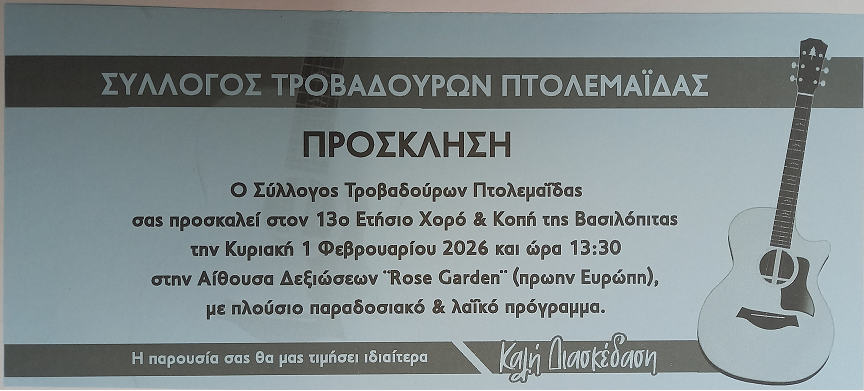 13ος Ετήσιος χορός Συλλόγου Τροβαδούρων Πτολεμαΐδας την Κυριακή 1 Φεβρουαρίου.