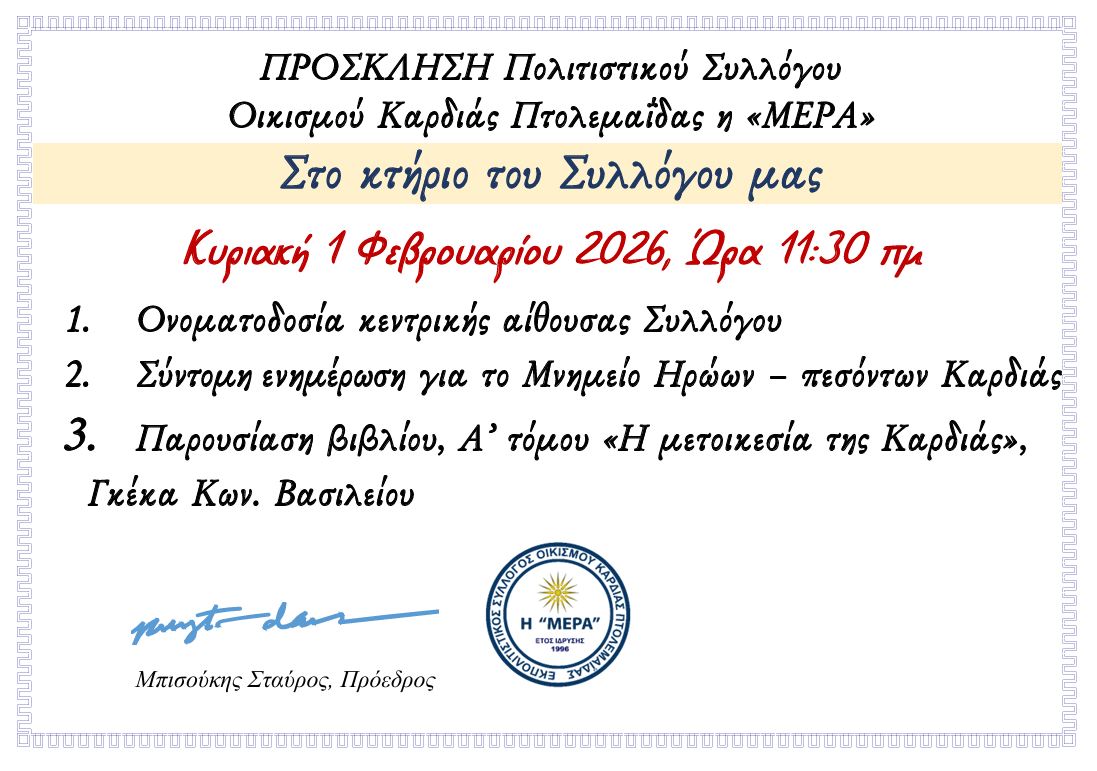 Εκδήλωση του Πολιτιστικού Συλλόγου Καρδιάς Πτολεμαϊδας η “ΜΕΡΑ”, την Κυριακή 1 Φεβρουαρίου