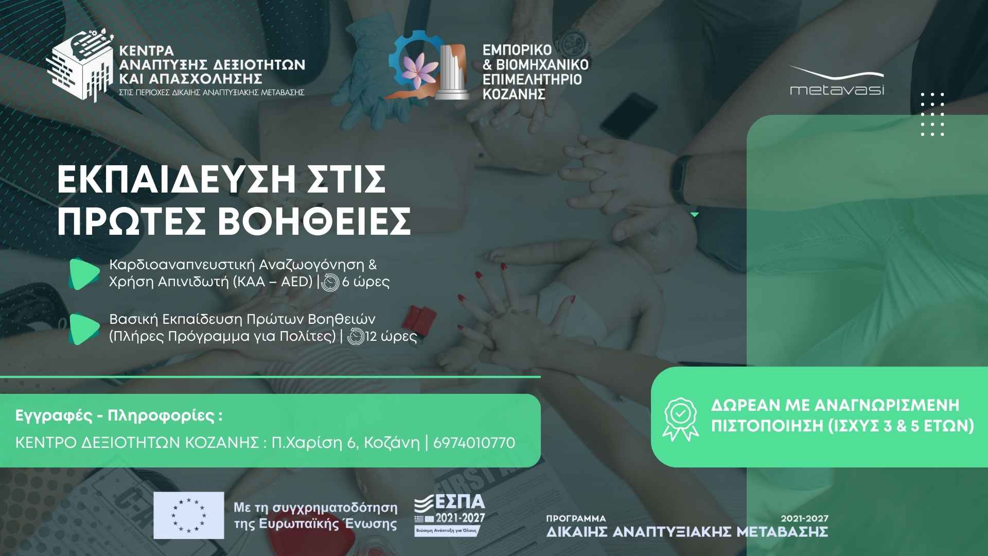 Η ΜΕΤΑΒΑΣΗ Α.Ε., μέσω των Κέντρων Ανάπτυξης Δεξιοτήτων, σε συνεργασία με το Επιμελητήριο Κοζάνης, τον Ελληνικό Ερυθρό Σταυρό και το Σωματείο Επαγγελματιών Εκπαιδευτών Οδηγών Δυτικής Μακεδονίας, ανακοινώνει την υλοποίηση δωρεάν προγραμμάτων εκπαίδευσης και πιστοποίησης Πρώτων Βοηθειών για επαγγελματίες εκπαιδευτές οδηγών.