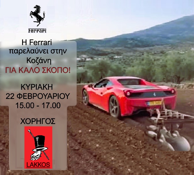 Καλούνται όλοι οι ιδιοκτήτες Φερράρι της πόλης να προσέλθουν στην μεγάλη παρέλαση της 22ας Φεβρουαρίου, η οποία θα εκκινήσει έξωθεν Λαϊκής Αγίας Παρασκευής, θα διασχίσει το Ιστορικό Κέντρο, θα διέλθει κάτωθεν Μαμάτσιου και θα καταλήξει έξωθεν Αλιάκμονος.