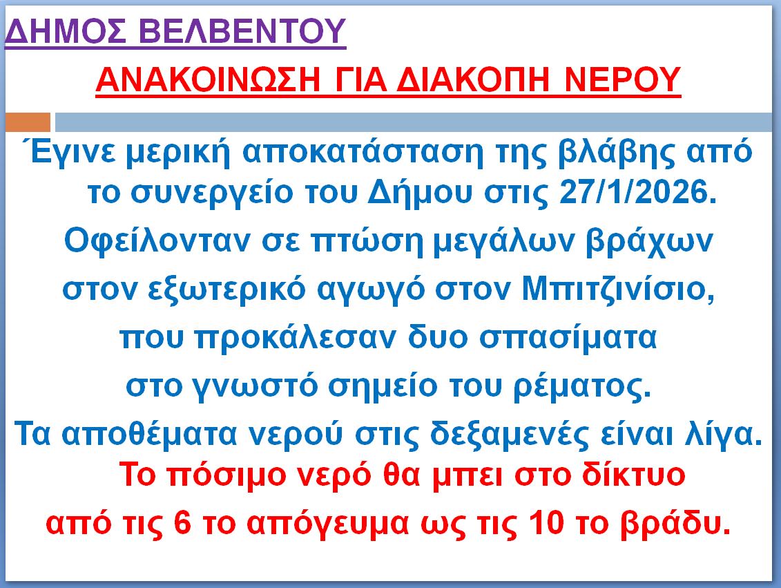 Έγινε μερική αποκατάσταση της βλάβης, που προκαλεί προβλήματα στην υδροδότηση του οικισμού. Τι αναφέρει η ανακοίνωση του Δήμου