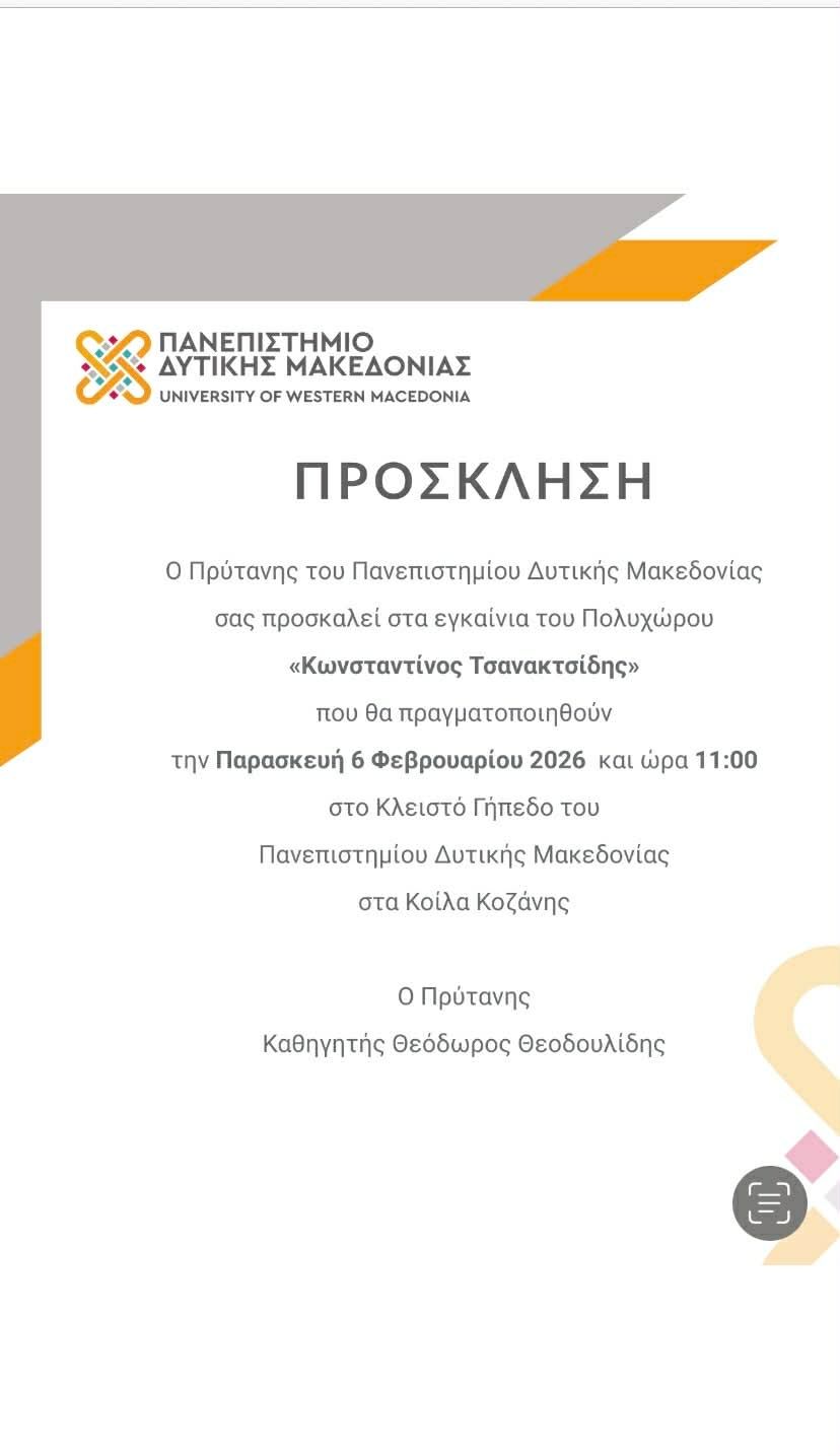 Την Παρασκευή 6 Φεβρουαρίου 2026 και ώρα 11:00 θα πραγματοποιηθούν τα εγκαίνια του Πολυχώρου «Κωνσταντίνος Τσανακτσίδης», στο Κλειστό Γήπεδο του Πανεπιστήμιο Δυτικής Μακεδονίας, στα Κοίλα Κοζάνης.