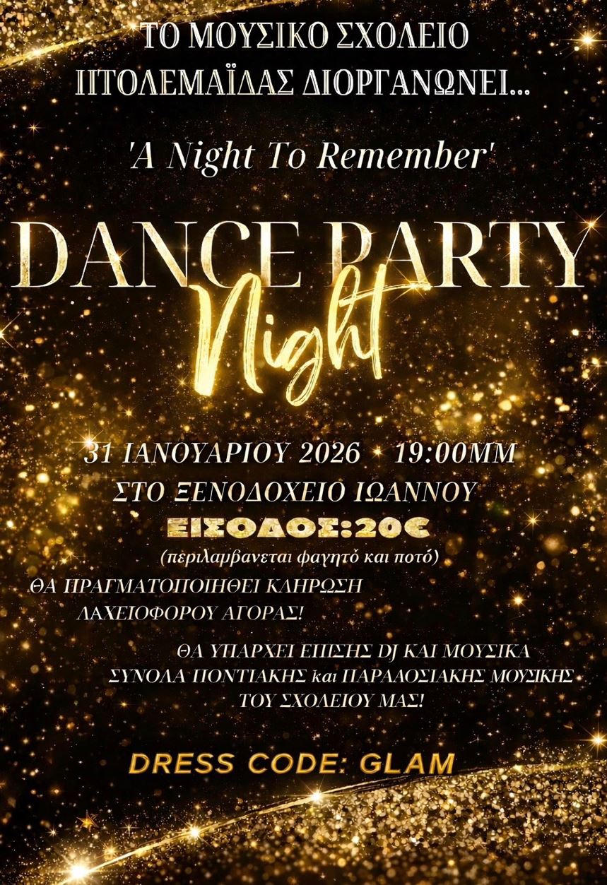 Ο Σύλλογος Γονέων και Κηδεμόνων του Μουσικού Σχολείου Πτολεμαΐδας «Νικόλαος Δούμπας» σας προσκαλεί σε έναν ξεχωριστό αποκριάτικο χορό, όπου το Glam, η λάμψη και η μουσική δίνουν τον πρώτο παλμό της Αποκριάς. Τη μουσική πλαισίωση της βραδιάς θα αναλάβουν το Ποντιακό και Παραδοσιακό Σύνολο του σχολείου μας, καθώς και Dj, για ένα γλέντι με ρυθμό και κέφι. Θα ακολουθήσει λαχειοφόρος αγορά με πλούσια δώρα για τους τυχερούς.