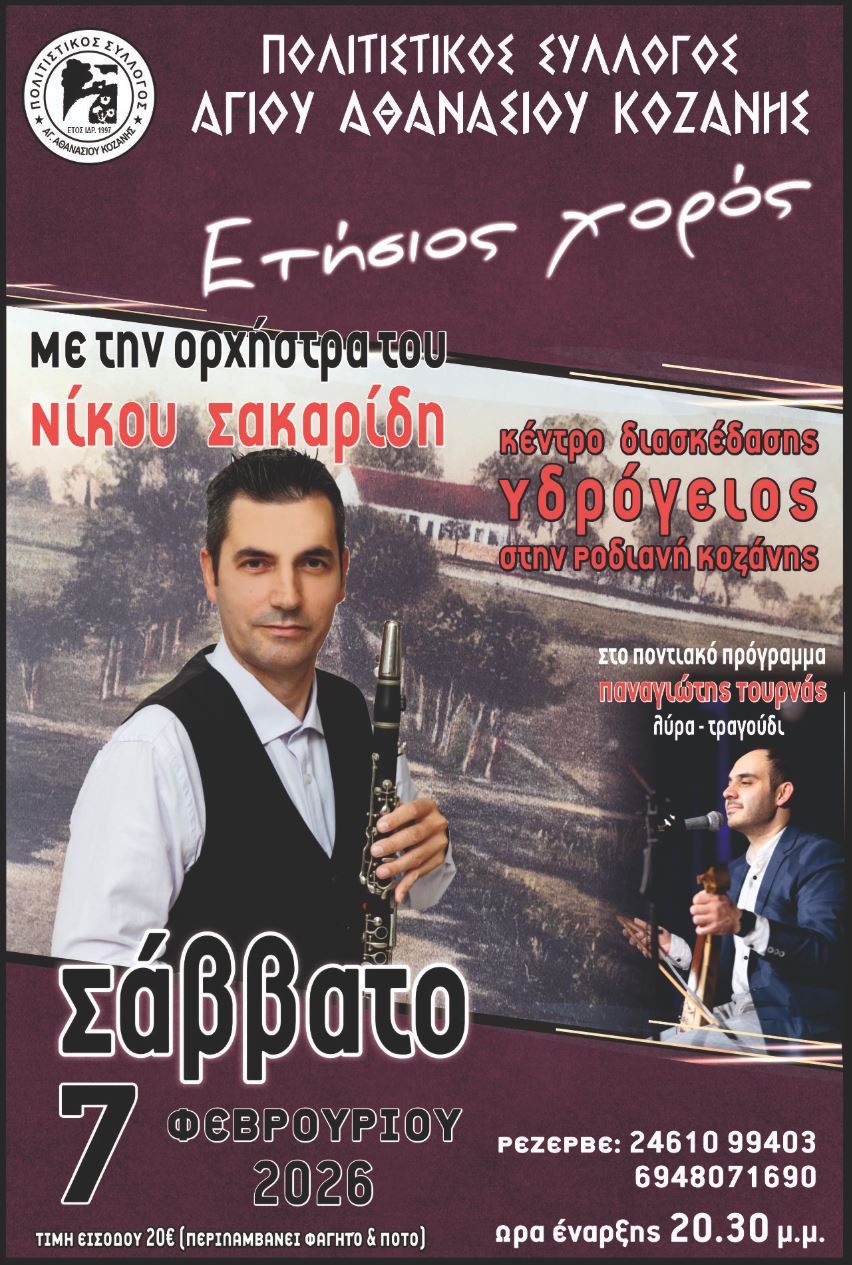 Ο Σύλλογός μας διοργανώνει τον ετήσιο καθιερωμένο χορό του στο οικογενειακό κέντρο « ΥΔΡΟΓΕΙΟΣ » στην Ροδιανή Κοζάνης. Καλούμε όλα τα μέλη, τους γείτονες, τους φίλους του συλλόγου Αγίου Αθανασίου και τους συμπολίτες μας το Σάββατο 7 Φεβρουαρίου στις 8.30΄μ.μ να συμμετέχουν όπως πάντα και να διασκεδάσουμε όλοι μαζί. Θα ξεφαντώσουμε με παραδοσιακά δημοτικά και ποντιακά τραγούδια.