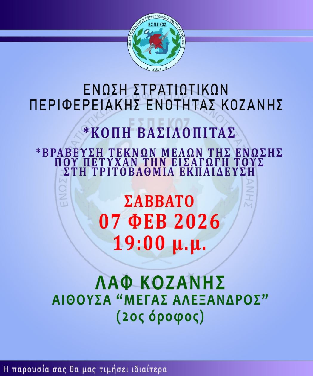 Η Ένωση Στρατιωτικών Περιφερειακής Ενότητας Κοζάνης, σας προσκαλεί, στην κοπή της βασιλόπιτας και στη βράβευση των μαθητών, τέκνων μελών μας, που συμμετείχαν την εισαγωγή τους στην τριτοβάθμια εκπαίδευση κατά το έτος 2025.