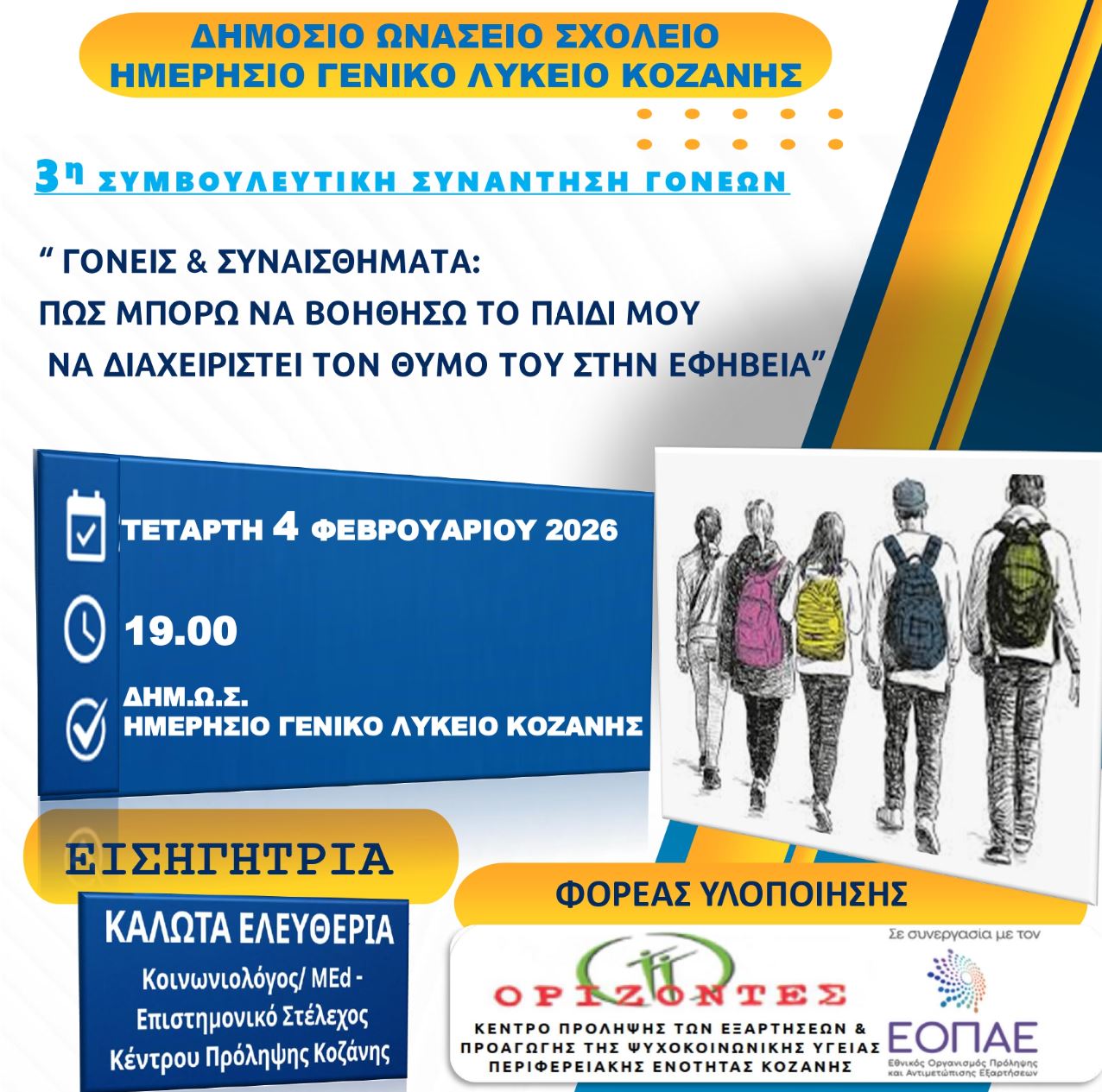 Το ΔΗΜ.Ω.Σ. ΗΜΕΡΗΣΙΟ ΓΕΝΙΚΟ ΛΥΚΕΙΟ ΚΟΖΑΝΗΣ, στο πλαίσιο λειτουργίας της Σχολής Γονέων, προγραμματίζει την 3η Συνάντηση, την Τετάρτη 4 Φεβρουαρίου 2026 και ώρα 19:00, στην Αίθουσα Εκδηλώσεων του σχολείου (Μακρυγιάννη 24, Κοζάνη) με την Κοινωνιολόγο, κυρία Καλώτα Ελευθερία, με θέμα: