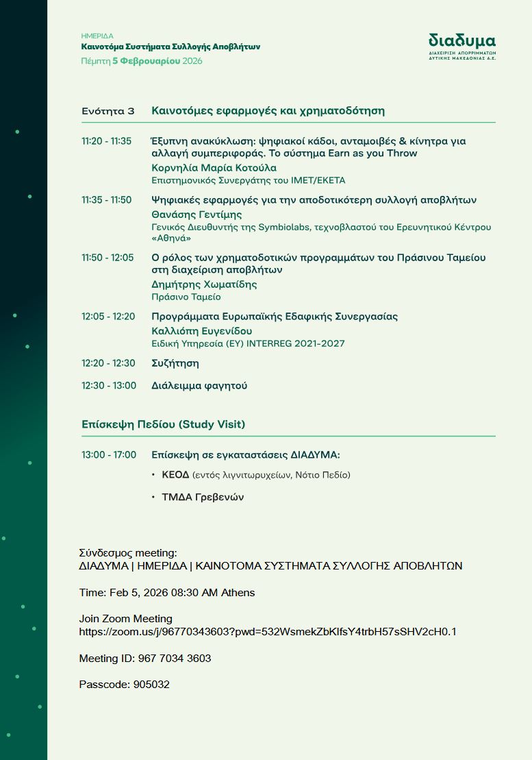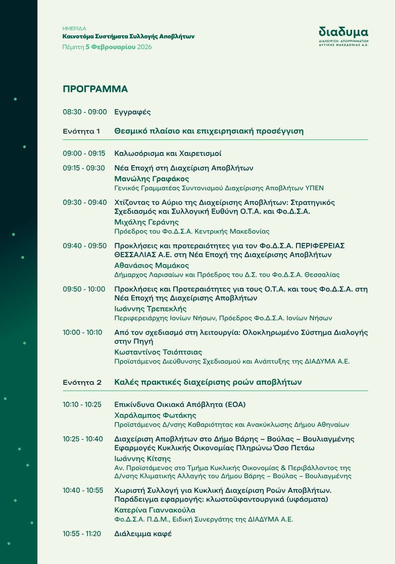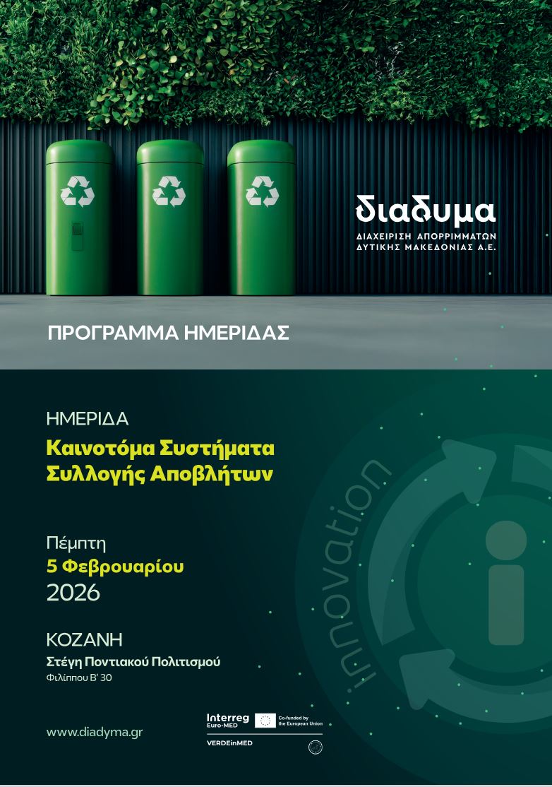 Ο ΦΟΔΣΑ Δυτικής Μακεδονίας (ΔΙΑΔΥΜΑ Α.Ε.) διοργανώνει την Πέμπτη 5 Φεβρουαρίου 2026 , στην Κοζάνη εξειδικευμένη Ημερίδα με τίτλο «Καινοτόμα Συστήματα Συλλογής Αποβλήτων», με στόχο την ενημέρωση και ανταλλαγή καλών πρακτικών για τη χωριστή συλλογή και την κυκλική διαχείριση ρευμάτων αποβλήτων, καθώς και την ανάδειξη εφαρμόσιμων λύσεων για τους Δήμους και τους ΦΟΔΣΑ.