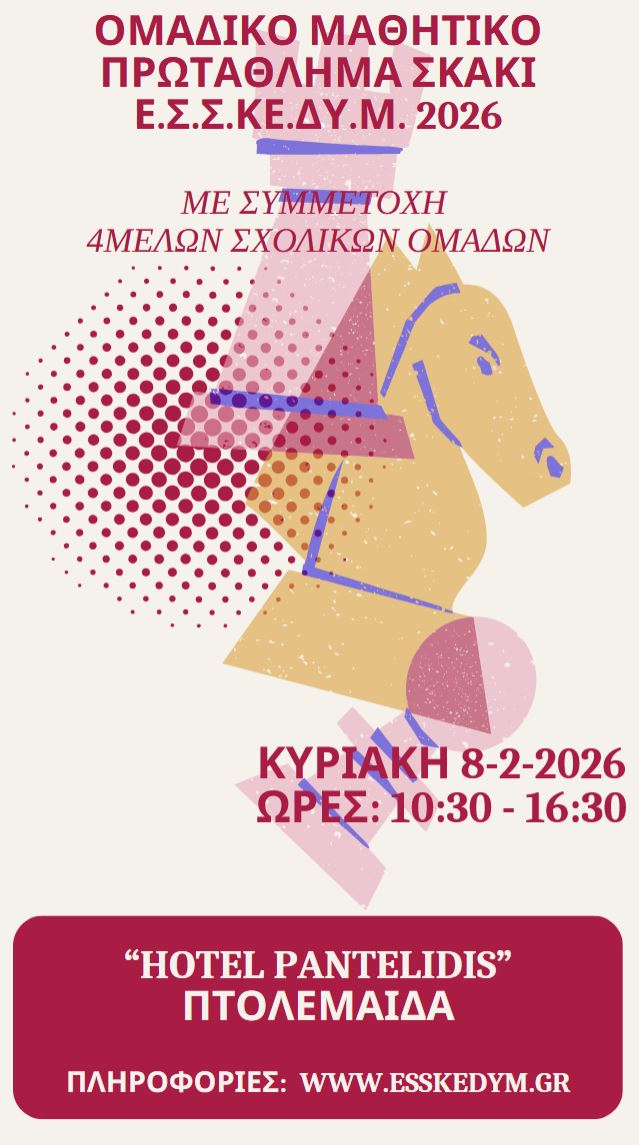 Η Ένωση Σκακιστικών Σωματείων Κεντρικής και Δυτικής Μακεδονίας, σε συνεργασία με τους Σκακιστικούς Συλλόγους Πτολεμαΐδας, διοργανώνει Ομαδικούς Μαθητικούς Αγώνες Σκάκι, με ανοιχτή συμμετοχή, από όλα τα σχολεία των Περιφερειακών Ενοτήτων, Γρεβενών, Ημαθίας, Καστοριάς, Κιλκίς, Πέλλας, Πιερίας, Κοζάνης και Φλώρινας, την Κυριακή 08-02-2026 και ώρα 10:30 π.μ. – 16:30 στο «PANTELIDIS HOTEL & SPA 4*» στην Πτολεμαΐδα (Περισσότερες πληροφορίες: www.esskedym.gr).