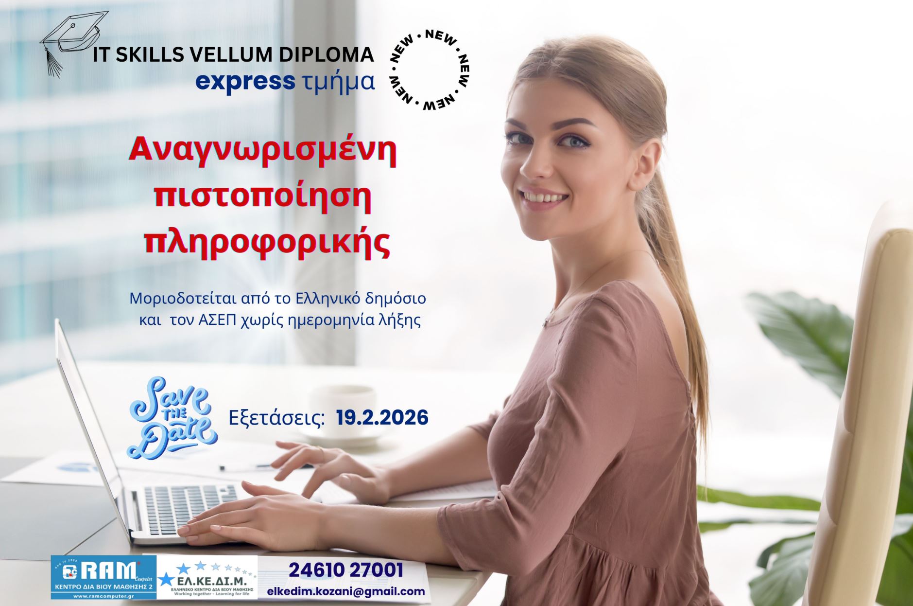 Το Vellum Diploma in IT Skills είναι πιστοποιητικό βασικών δεξιοτήτων πληροφορικής βασισμένο στο λογισμικό του Ms Office, που εξετάζει τις πιο σημαντικές δεξιότητες της Τεχνολογίας των Πληροφοριών, αυτές δηλαδή που απαιτούνται κατά τη διάρκεια όλων των βαθμίδων της εκπαίδευσης, στην εργασία αλλά και στην καθημερινότητά μας. Πληροί τα κριτήρια και της Κ.Υ.Α. υπ’ αριθ. 33198/Κ6/2023 – ΦΕΚ 1961/τ. Β/27-03-2023 και συγκαταλέγεται ανάμεσα στα έγκυρα πιστοποιητικά Βασικών Δεξιοτήτων Πληροφορικής για τις προκηρύξεις δημόσιων οργανισμών και του ΑΣΕΠ.