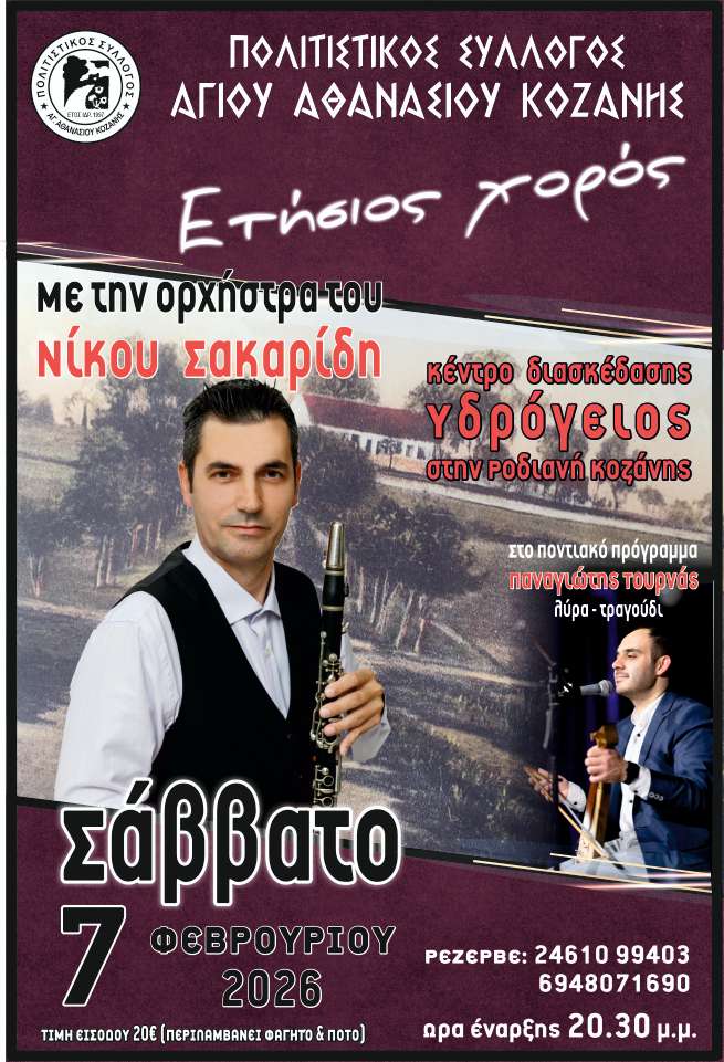 Ο Σύλλογός μας διοργανώνει τον ετήσιο καθιερωμένο χορό του στο οικογενειακό κέντρο « ΥΔΡΟΓΕΙΟΣ » στην Ροδιανή Κοζάνης. Καλούμε όλα τα μέλη, τους γείτονες, τους φίλους του συλλόγου Αγίου Αθανασίου και τους συμπολίτες μας το Σάββατο 7 Φεβρουαρίου στις 8.30΄μ.μ να συμμετέχουν όπως πάντα και να διασκεδάσουμε όλοι μαζί. Θα ξεφαντώσουμε με παραδοσιακά δημοτικά και ποντιακά τραγούδια.