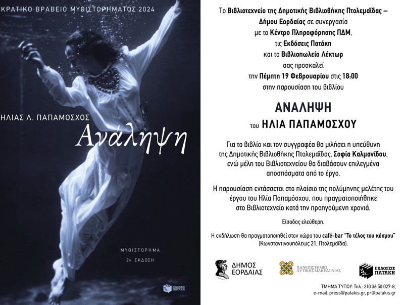 Το Βιβλιοτεχνείο της Δημοτικής Βιβλιοθήκης Πτολεμαΐδας – Δήμου Εορδαίας, σε συνεργασία με το Κέντρο Πληροφόρησης ΠΔΜ και τις Εκδόσεις Πατάκη, διοργανώνουν παρουσίαση του μυθιστορήματος Ανάληψη του Ηλία Παπαμόσχου.